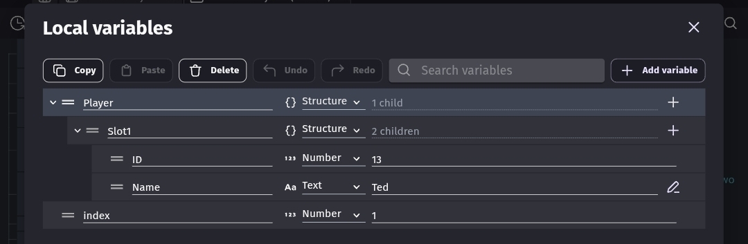I need to access the child variable by their name but also need to specify with another variable which structure variable they are under. no matter what I try nothing works. here are my variables