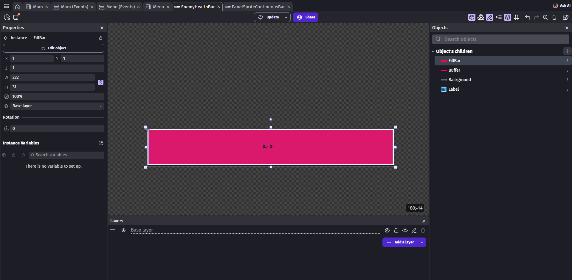However, because I have virtually zero experience in GDevelop’s extensions/function field, the text is off center and it scales weirdly, and the center of the healthbar is not at its center either.