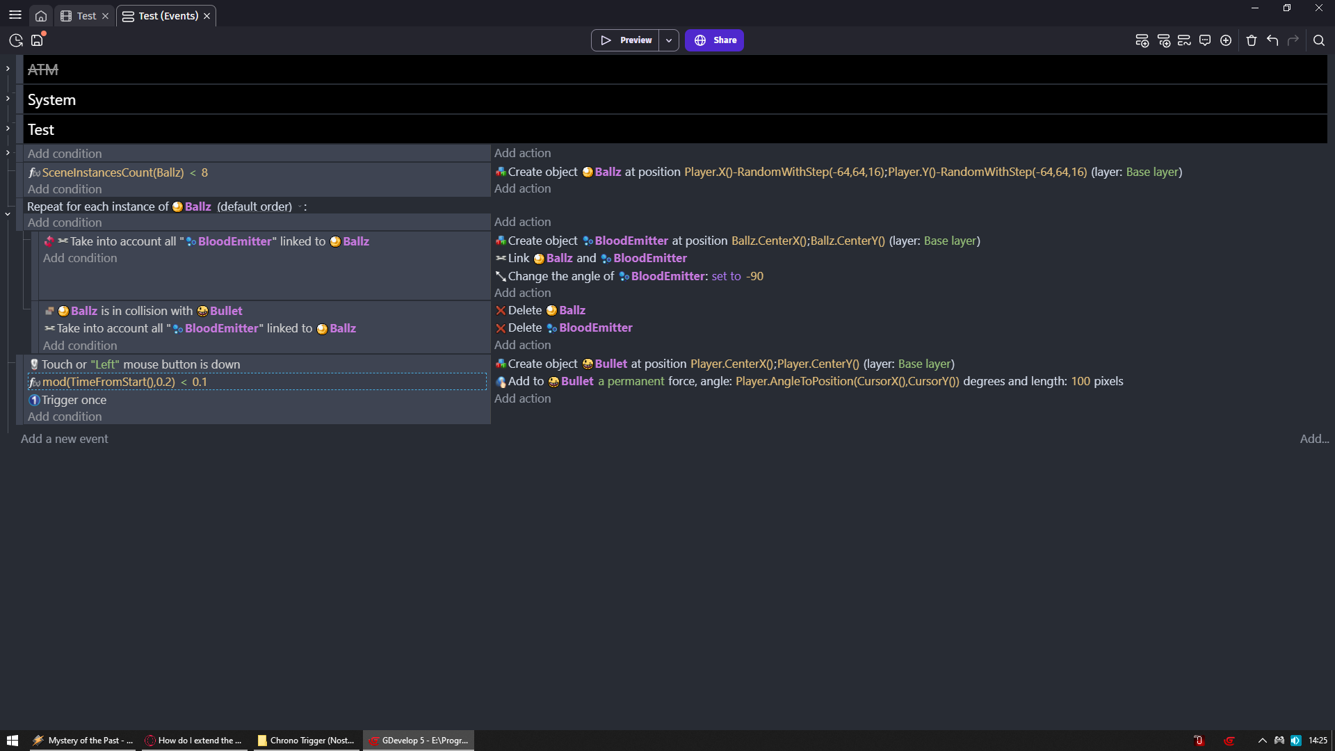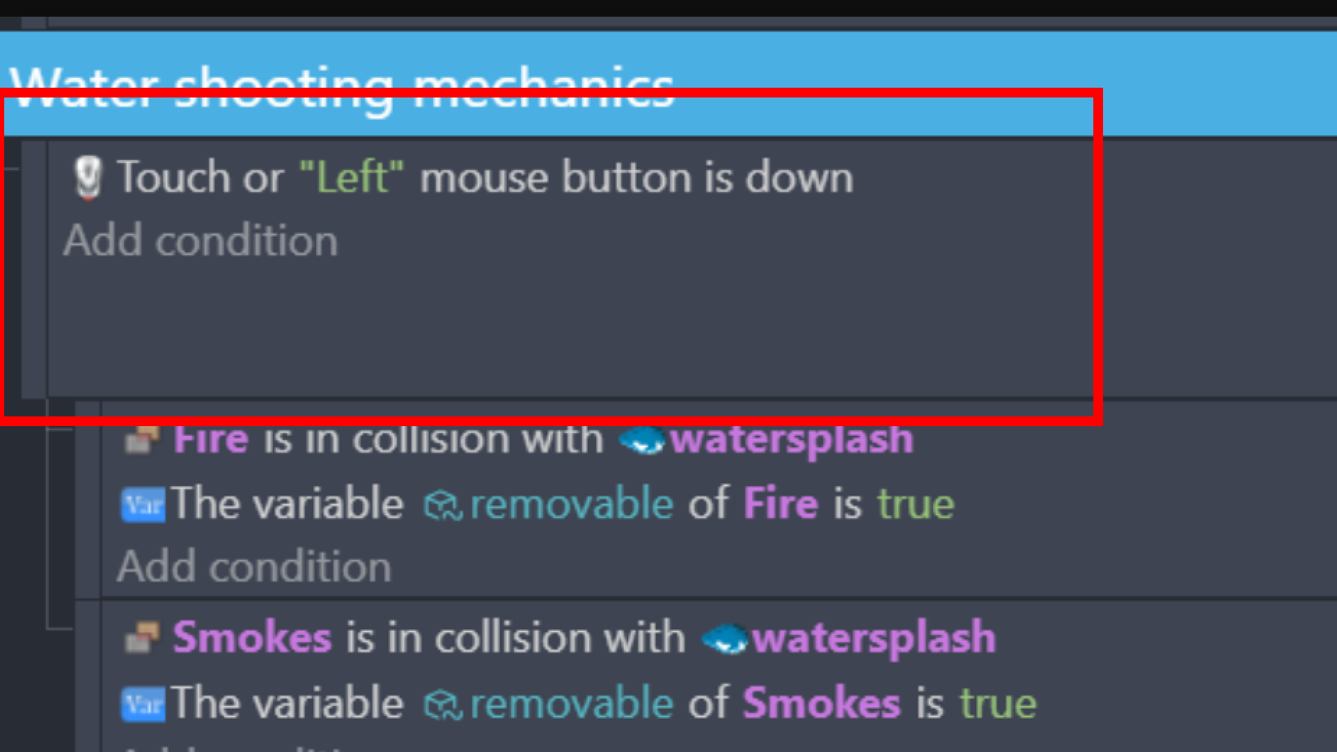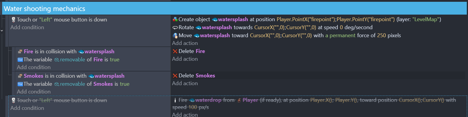 For whatever reasons, my firebullet extension is not working properly on my project on any of the scenes in it but works on my other project, so I tried another approach of creating my bullets but it only deletes the fire that is close to the water sprite’s creation point.