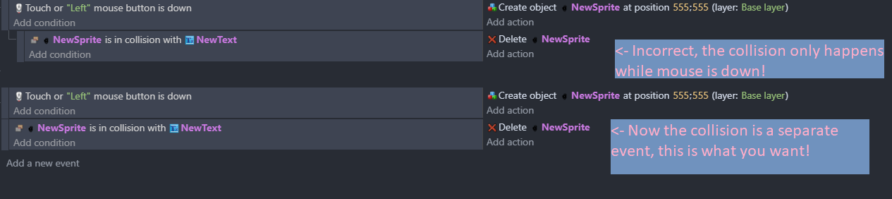 If you instead did an action like, spawn an object at NewSprite.X()/NewSprite.Y(), then you would have a problem because the object will only spawn once, at the coordinates of the first NewSprite in the pick list. Even if you had five NewSprite in collision, only one object would spawn. This is where you would need a For Each to spawn an object at all five locations.