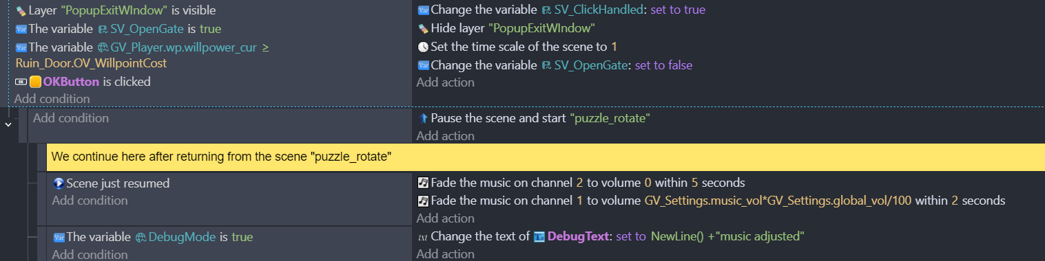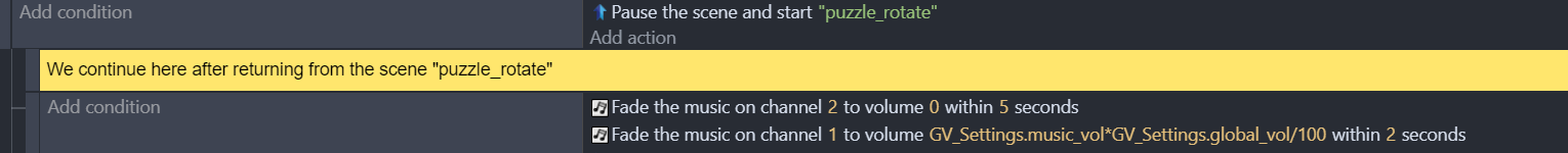 and here things go haywire - the fade doesn’t work (the music from scene2 just continues) and the “old” music on (channel 1) does not fade in again.