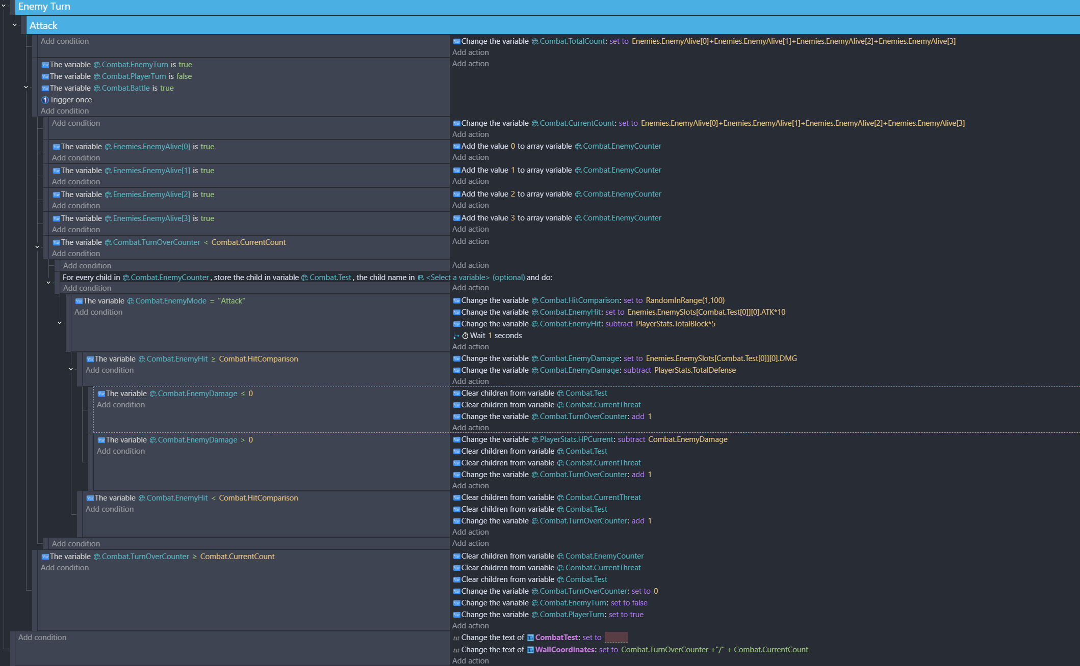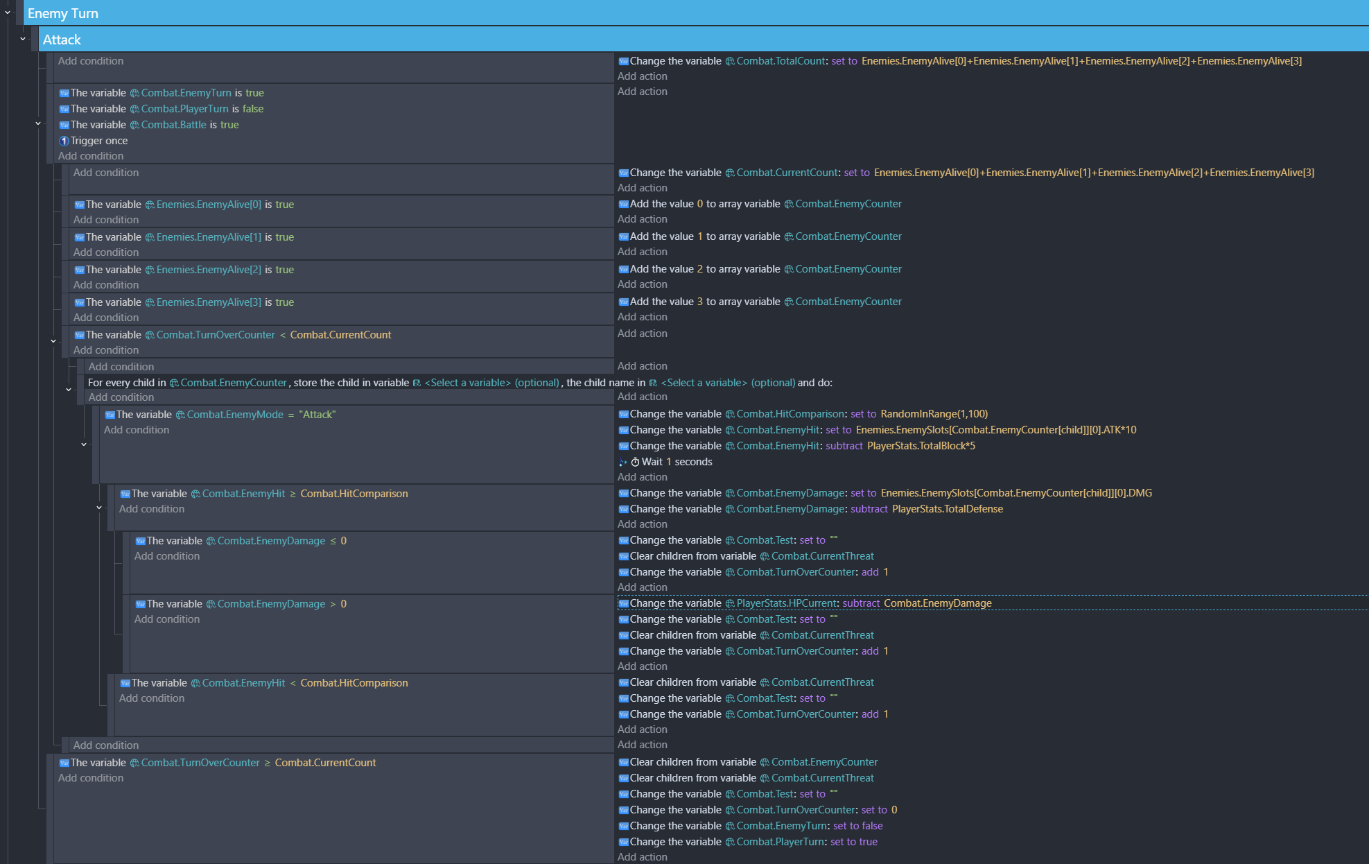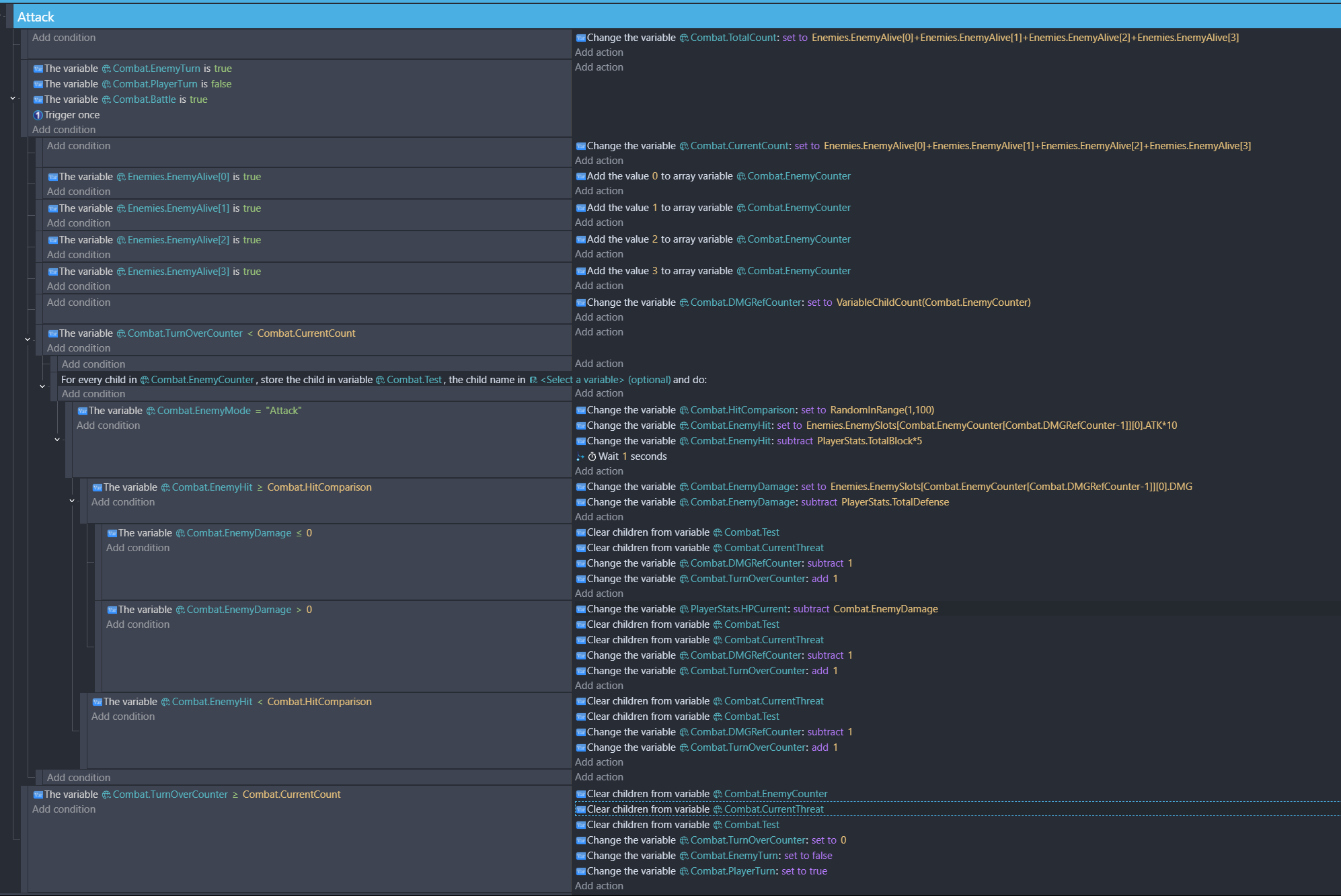 I’m working on a turn-based combat system. The goal is to have each enemy (of up to four) go through the attack event group before cycling to the next enemy until there are none left that haven’t attacked, at which point the enemy turn is ended. At the beginning of the turn, I check if each enemy slot is filled (enemy is alive). If a slot is full, I add its corresponding value (i.e., “2” for slot2) to an array variable named Combat.EnemyCounter. I then have a “for each child of Combat.EnemyCounter event” as the superordinate event of my attack sequence. Enemies are structure variables stored as children of an array for each enemy slot.
