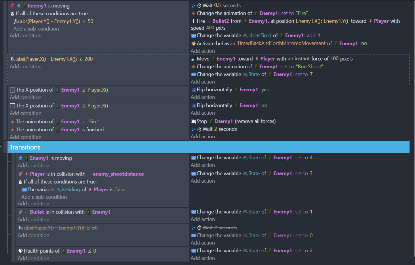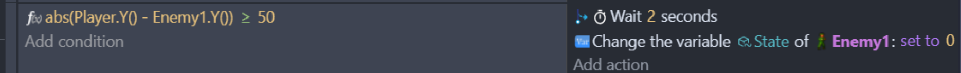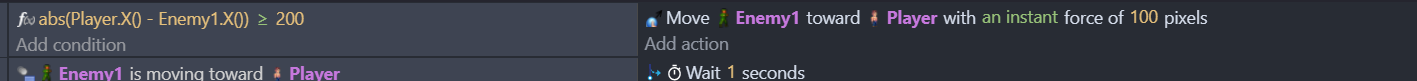 I’m using so the enemy isn’t attempting to shoot until he’s under 200 pixels to the player. I do a similar action to the Y position so the enemy isn’t going into behavior/actions if the Player is above or below 50 pixels in height to them.