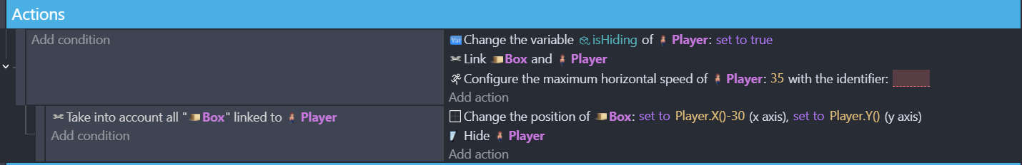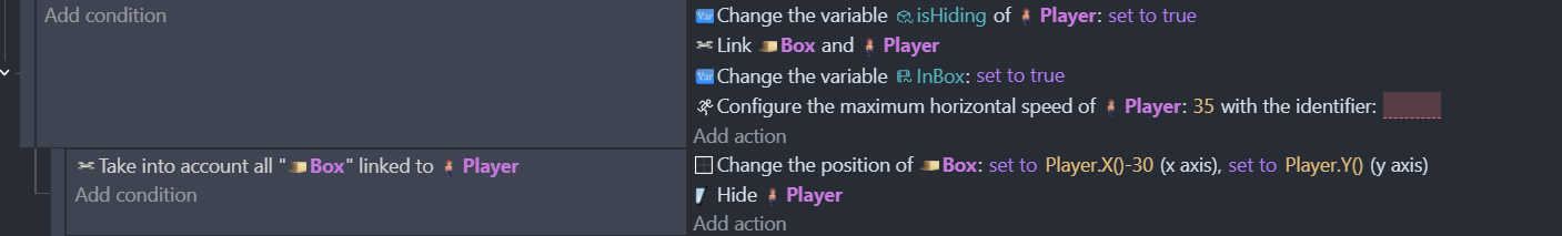 Btw. I did pull the sub event out and added a variable (as you did in your example) to the object. And I specified the box nearest to the Player instead of ‘any’ box. Atm the scene only had one box but that would be problematic if there were multiple ones in a level.