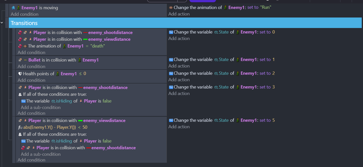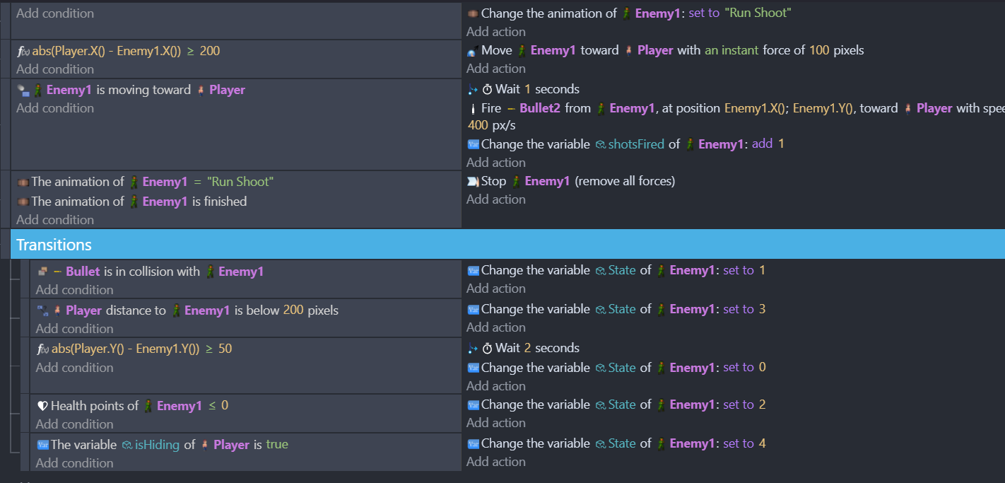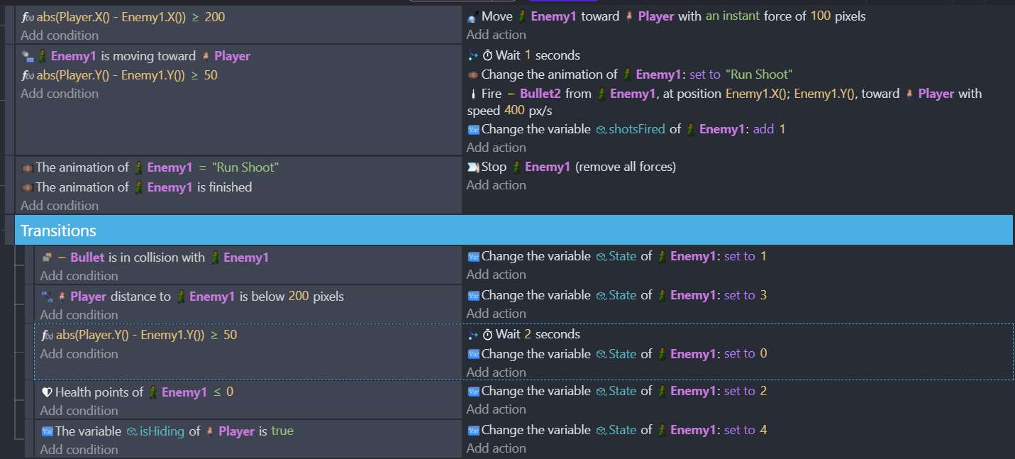 Majority that I have are just animations to play. But on the ‘Enemyshoot’ state it’s an empty condition: