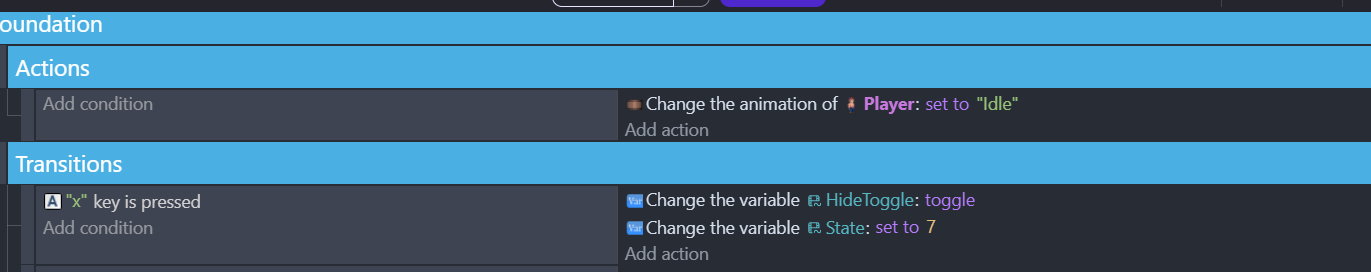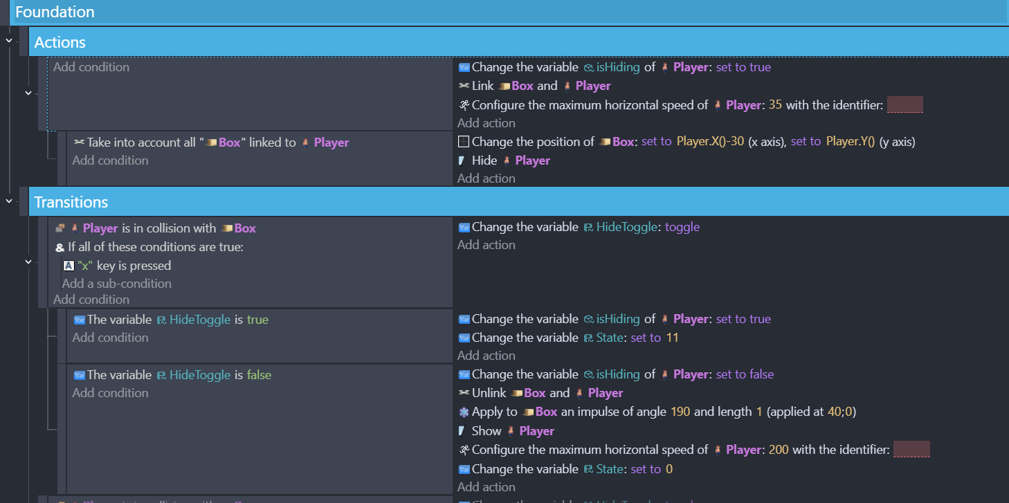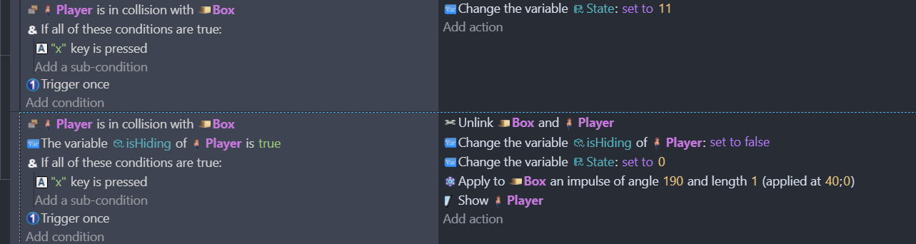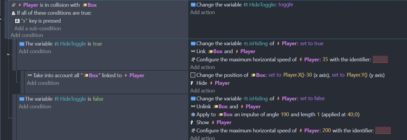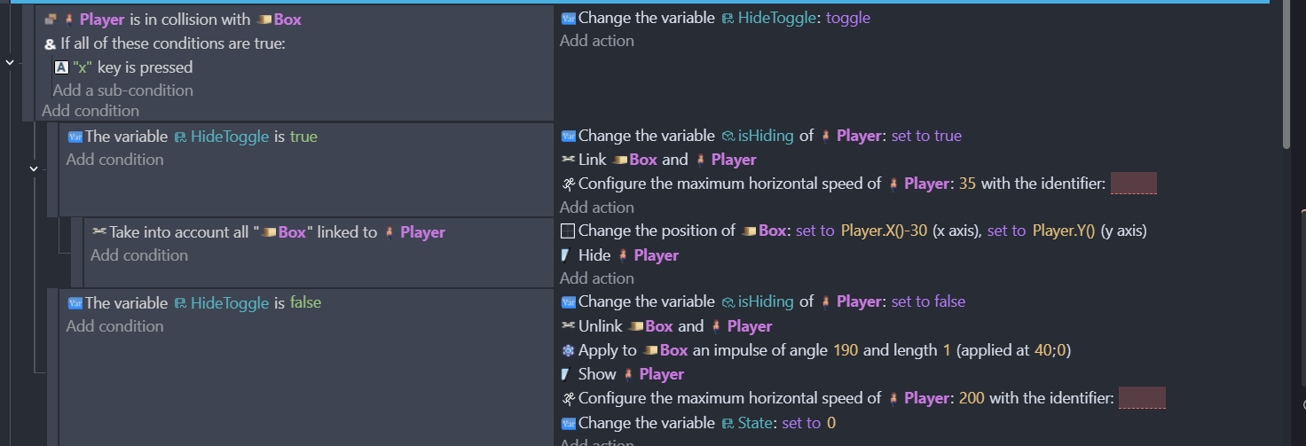 So I have the player character using the ‘x’ key to hide in a box sprite when he’s near it. And then move as the box. I have this part working, but I want to have the ‘x’ also toggle unhiding from the box. I’ve been able to trigger it by doing other actions (jump, shoot) but want to have the x be a toggle.