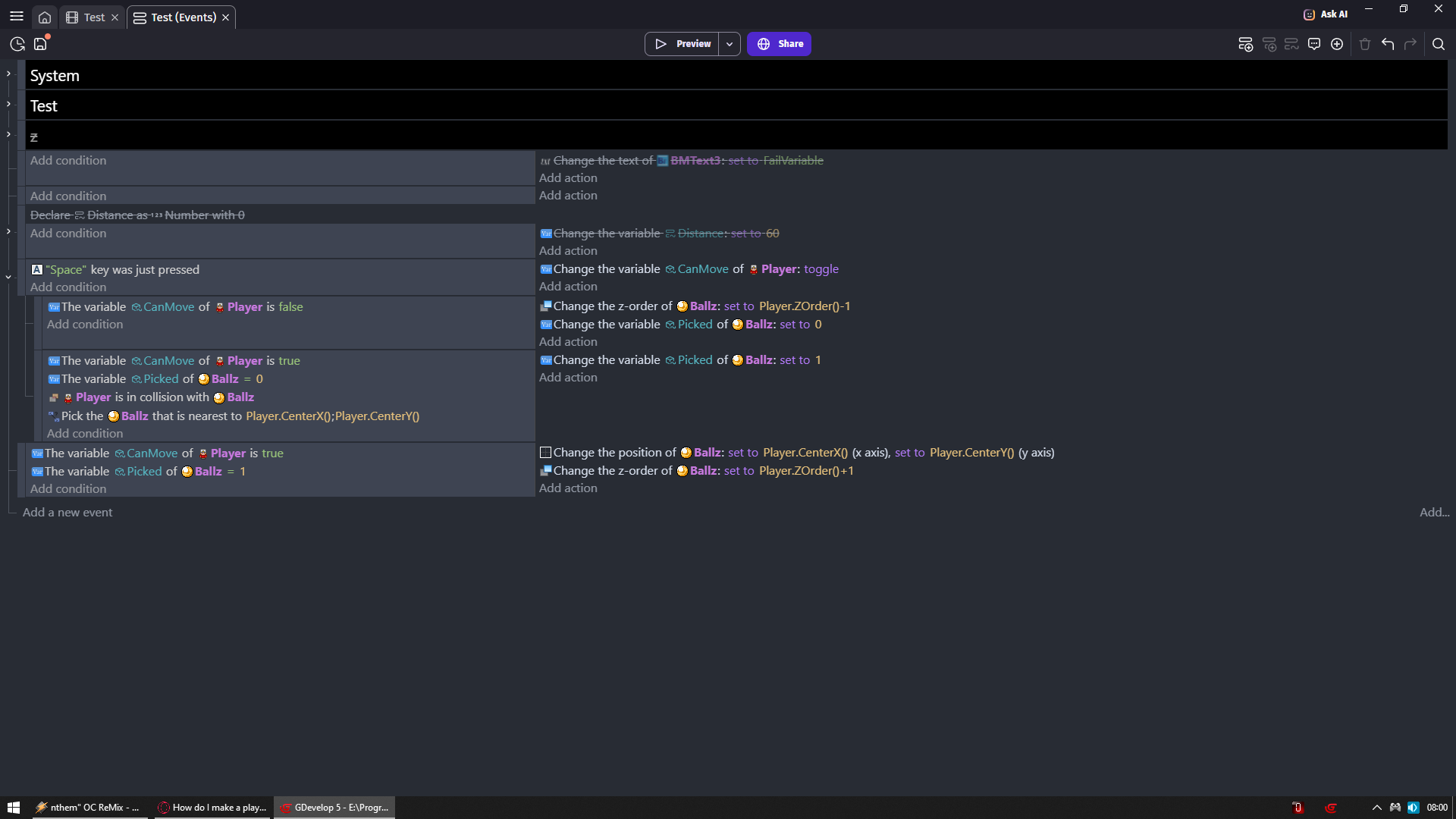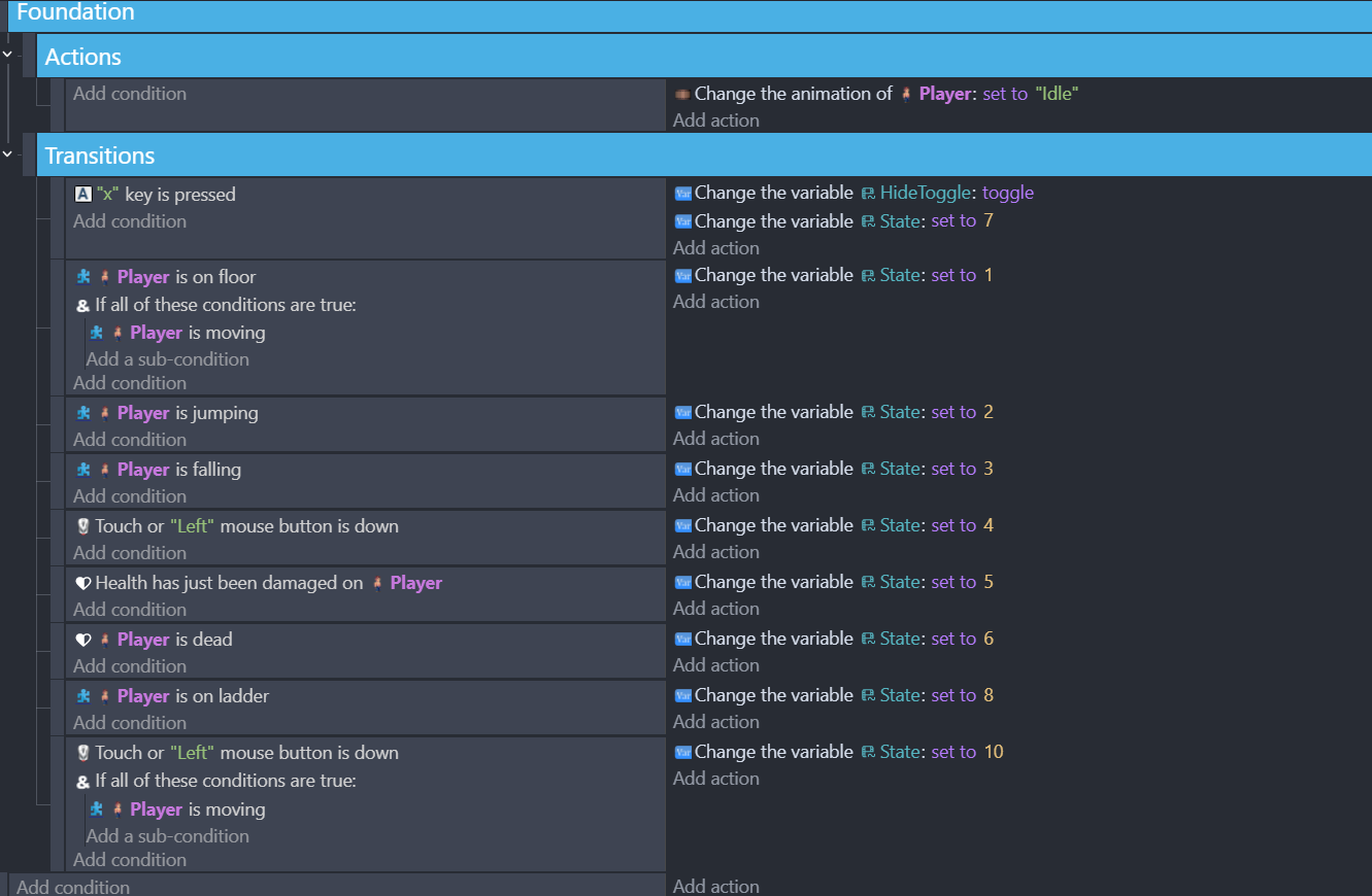 So I’ve been using AND statements because when I don’t the actions break. So I’m putting conditions for each of the animations so they don’t play every frame for everything.