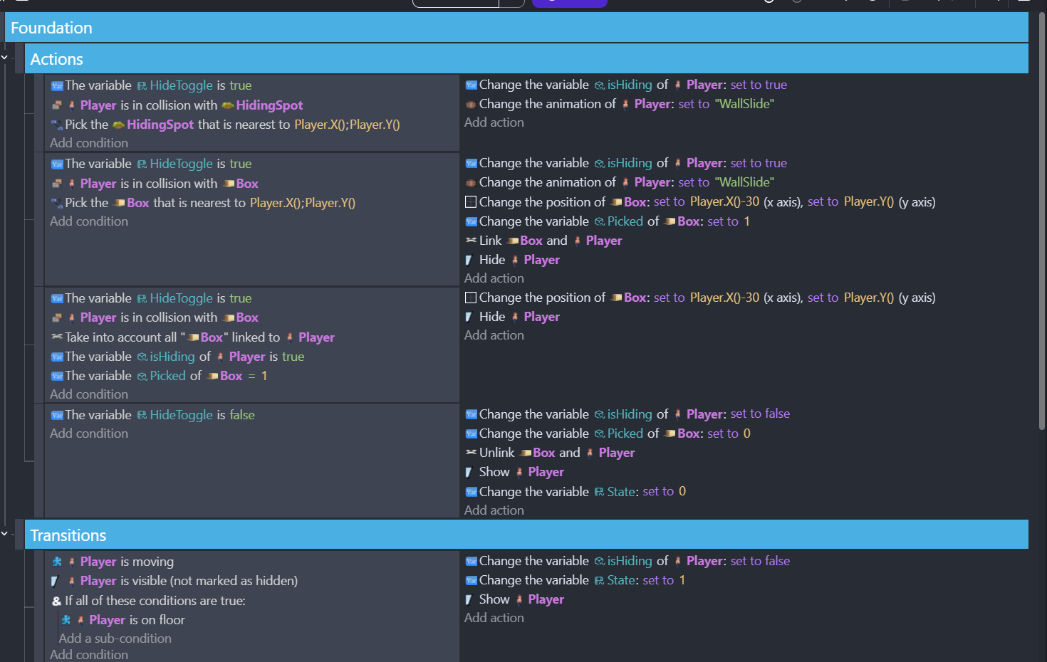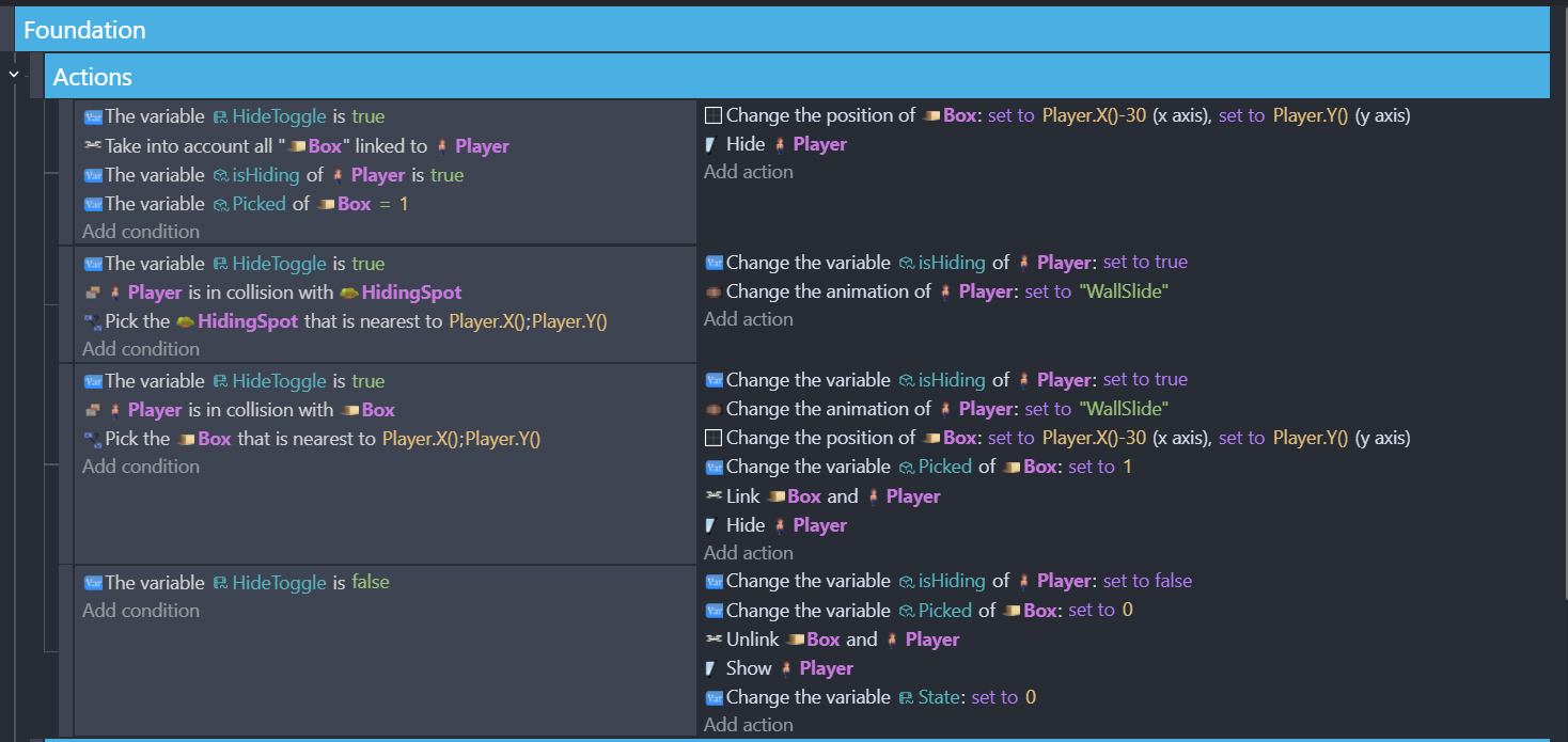I’ve tried changing the condition and adding sub-conditions, all that happens is the hiding no longer works because the player is colliding with the box both to hide and unhide so it’s trying to do both at the same time.
