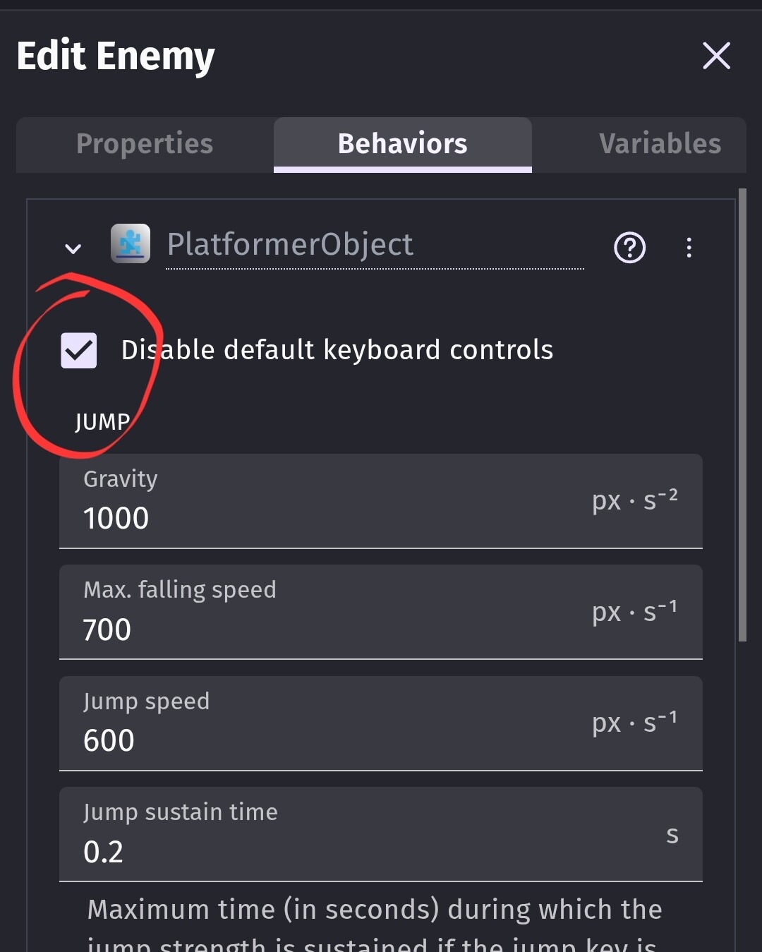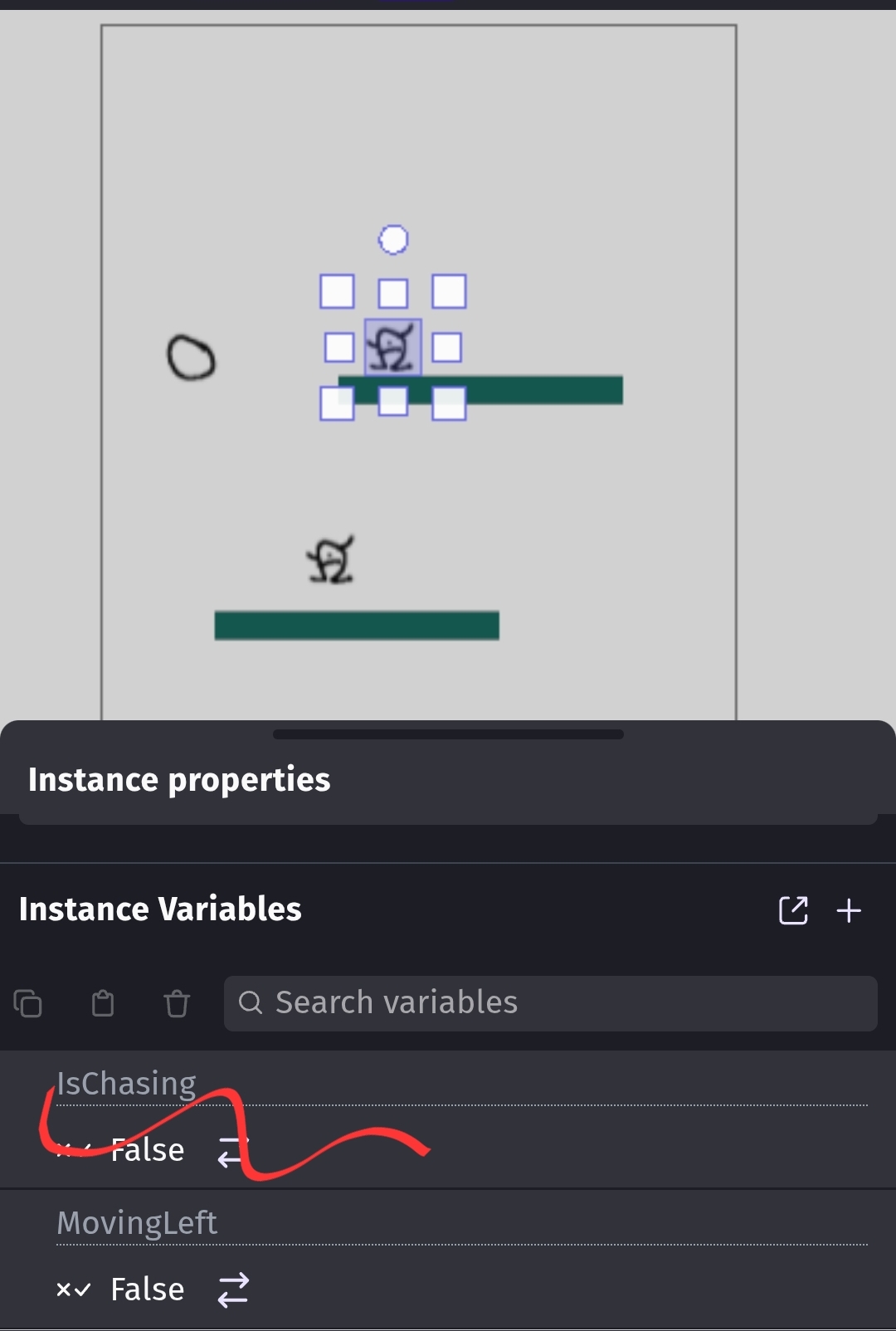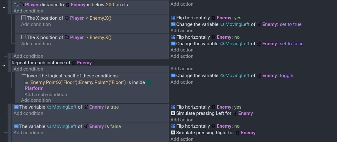These are my test events. I added a point to the enemy to detect if it wasn’t on a platform. It uses an enemy boolean object variable named MovingLeft.