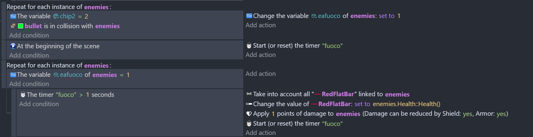 Hello, How do I do that when a bullet collides with an enemy in the group “enemies” a variable “eafuoco” changes to 1 and when this variable is = to 1 every 1 second the enemy that got shot (and has the variable eafuoco = to 1) will get damage every 1 second.