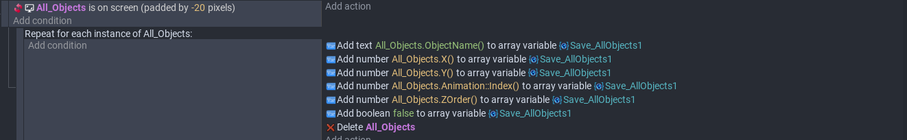 How do I Make my game delete and create objects on and off screen. I have seen similar posts but I dont understand a proper awnser. I have attached a picture showing my game event sheets for each.