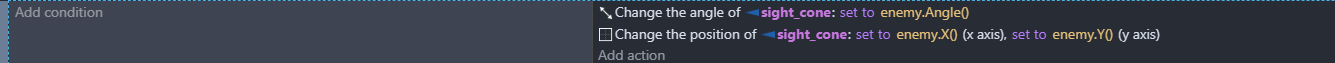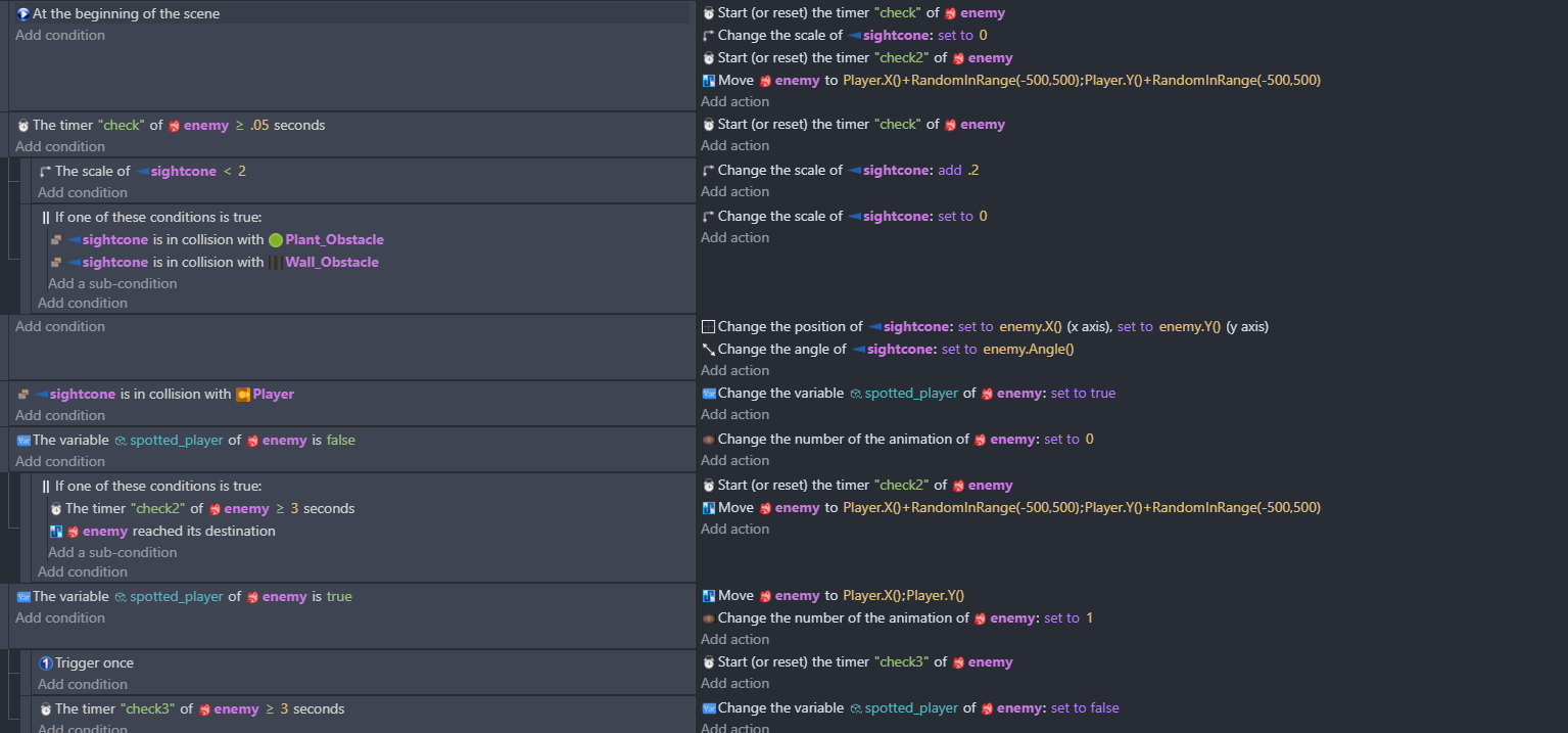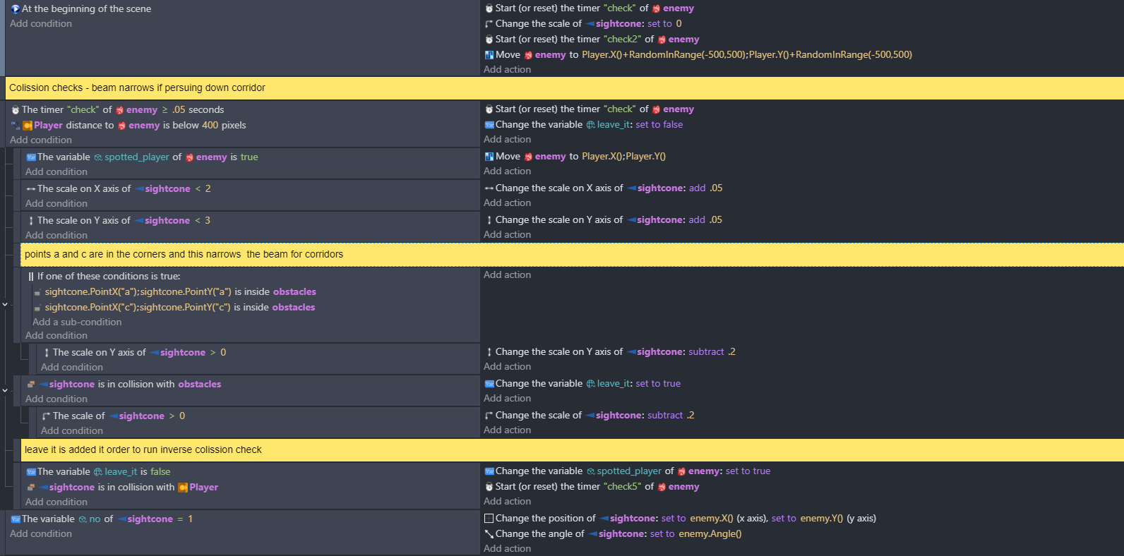 Hi, im currently working on a hotline miami style game. I got the enemy ai worked out, they can hear the player, see the player, investigate and walk their routines. However, they are blind asf. They can only see the player when its right in front of them. I tried fixing this by adding multiple raycasts with a few pixels between them instead of just one raycast in the middle, but since the enemies constantly rotate to a random angle of the location they wanna go, Array variables to change the ray angle based on their movement doesnt work.