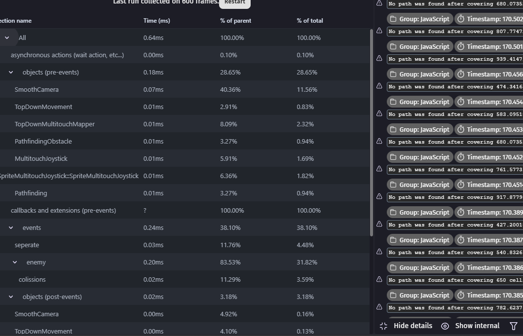This is with three expanding sight cones and with 5 enemy. The profiler was .64ms with 3.59 percent of total on collisions and loads of pathfinding error calls