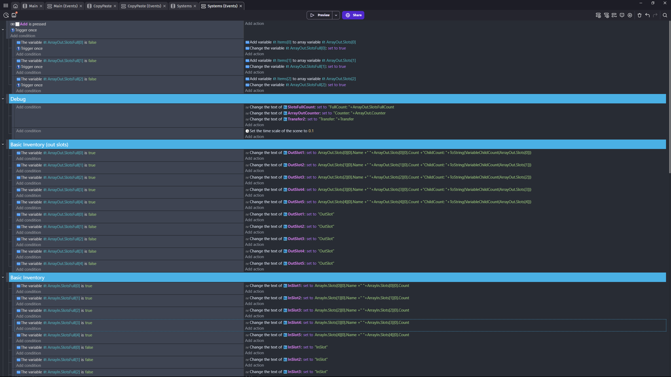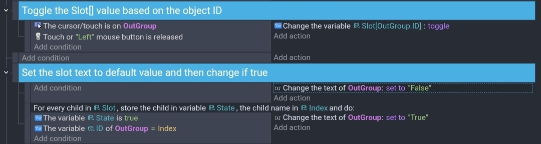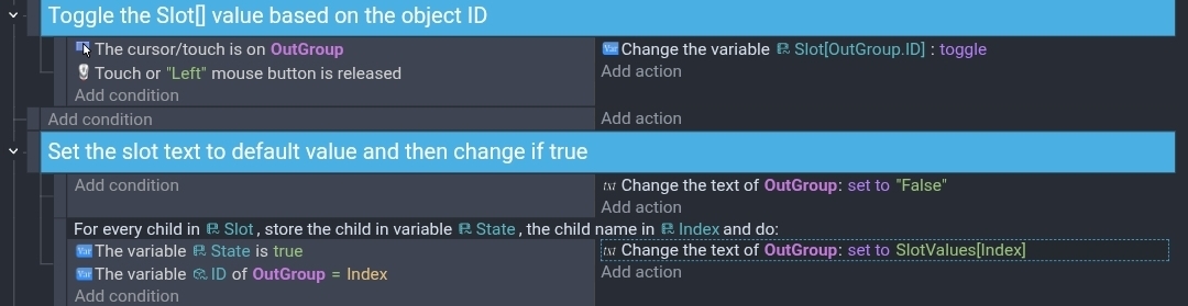 One thing I also noticed. Instead of checking for true and false, you could preemptively set your text objects to like “OutSlot” before the other events and then just check for the true state. That cuts the events in half. You could put the text objects in a group or use copies of the same object.