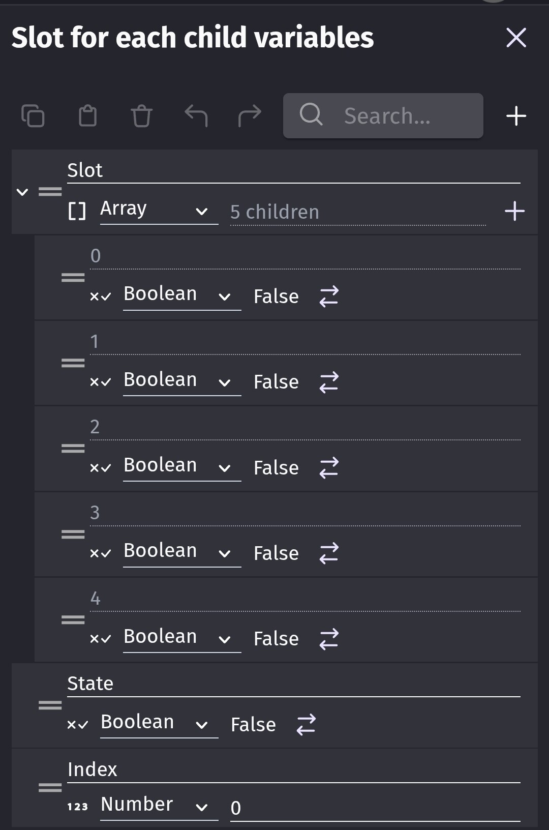 Here’s an example using for each child. For testing, it toggles the slot array booleans by touching the corresponding text object using an object ID value. Since arrays start at 0, the IDs also start at zero.