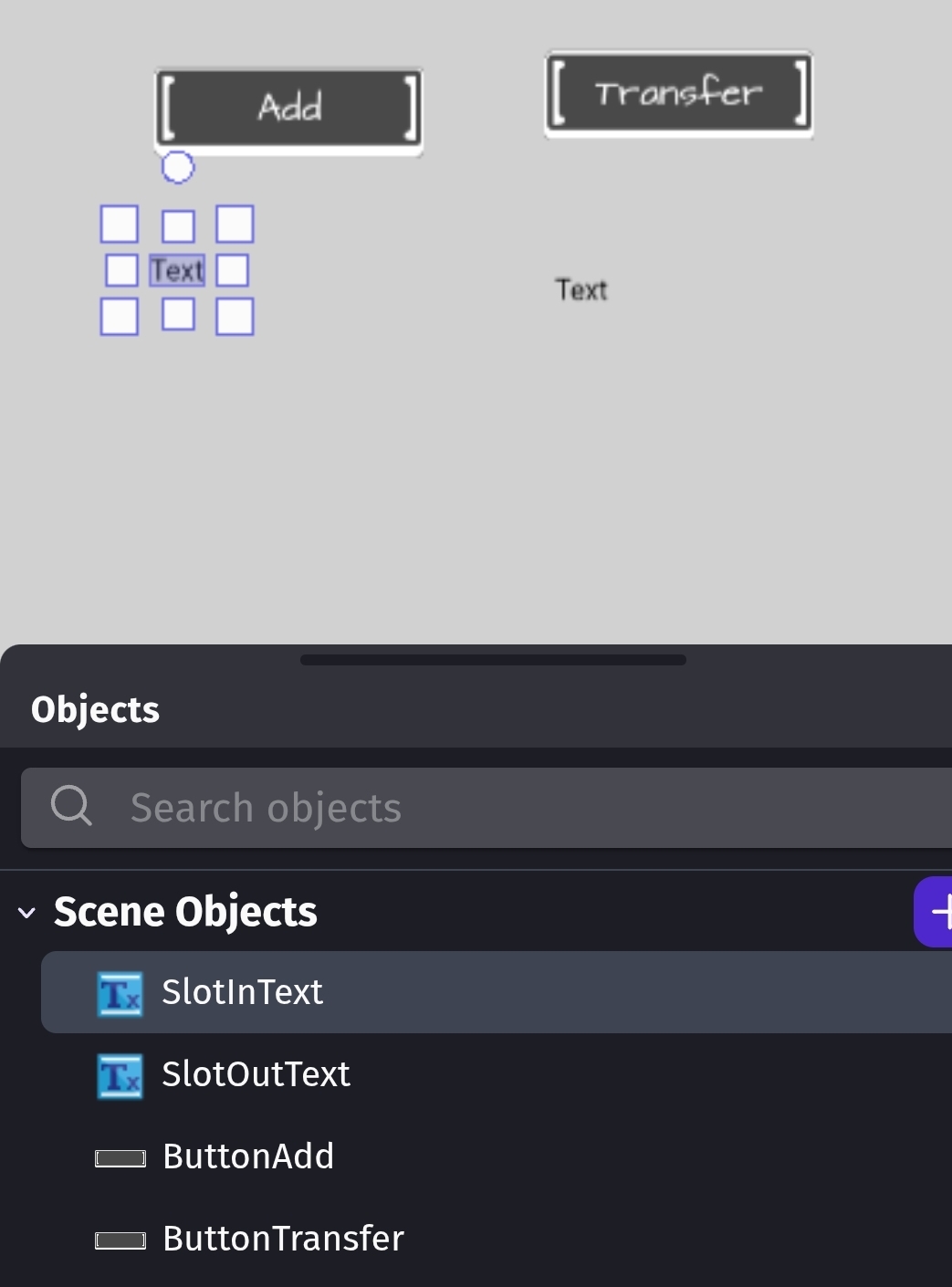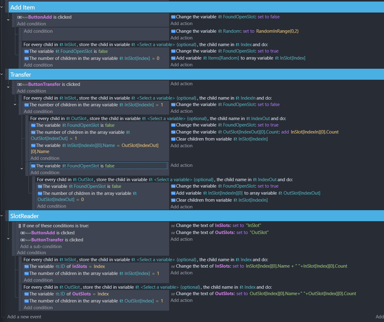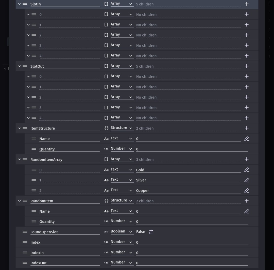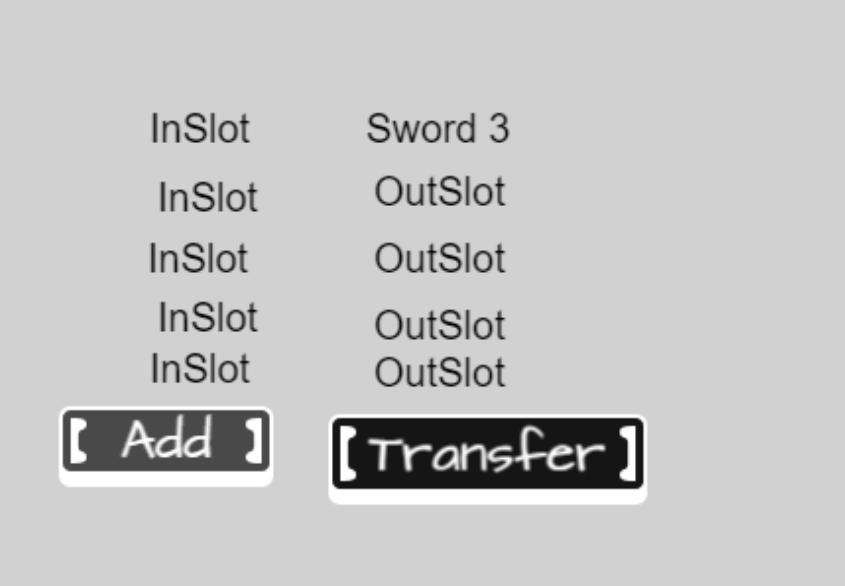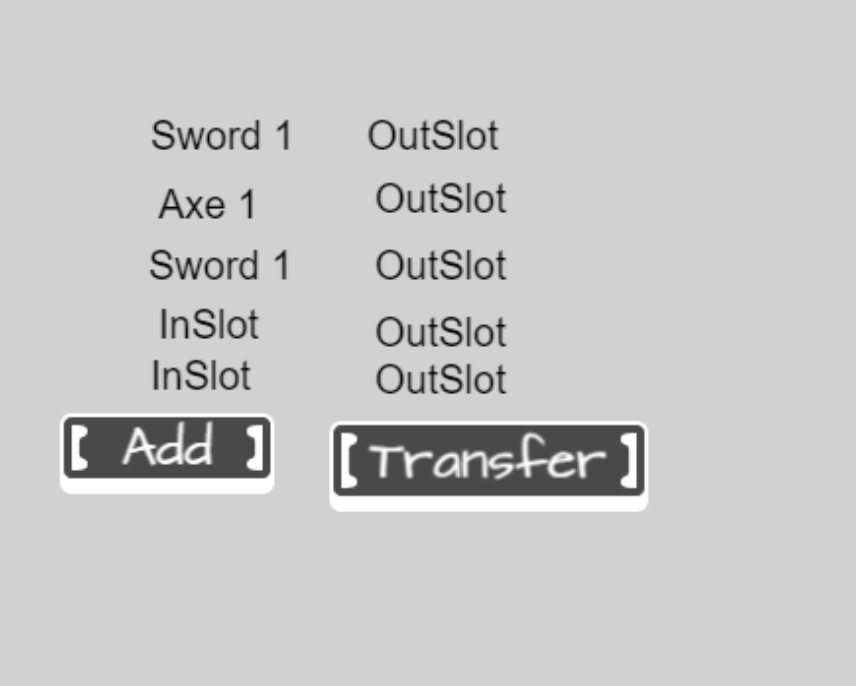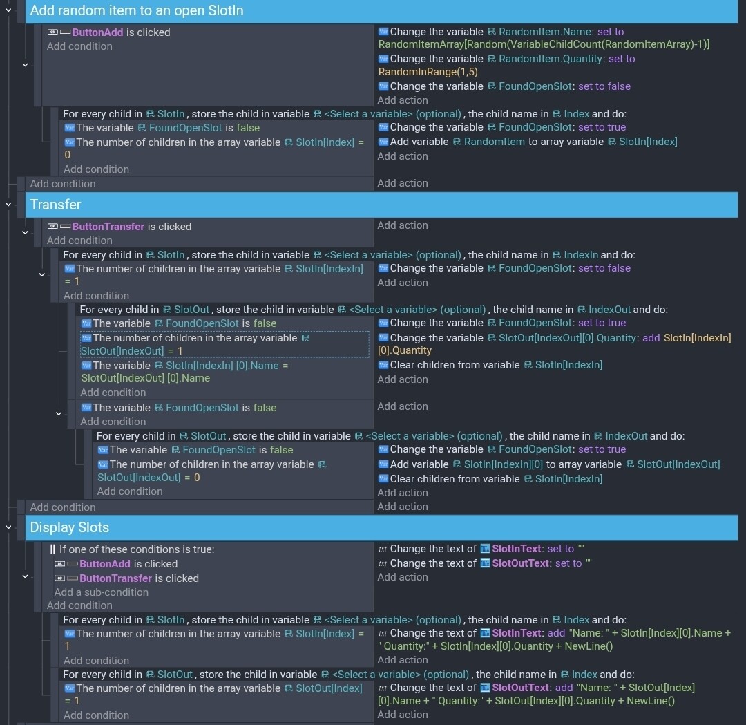 There are two counters that run through their respective arrays, checking if a slot is “empty” (does not have a child variable). If this is the case, then the item with the index of the current counter value is added to the receiving array and cleared from the giving array. If a slot is “full” (has a child variable), then the ID (an arbitrary number that is a child of the item variable) of the two items are compared, and if they match a quantity child variable of the item is increased.