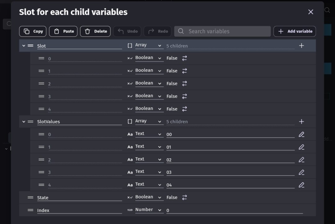 I wanted to try to emulate your concept. It took me a bit to understand your intent and how to implement it. I feel it would be easier to use a single dimensional array of structures instead of basically a 2 dimensional array. Meaning slot[0] instead of slot[0] [0]. I’m going back to work tomorrow. So, I might not have enough free time to play with the concept.