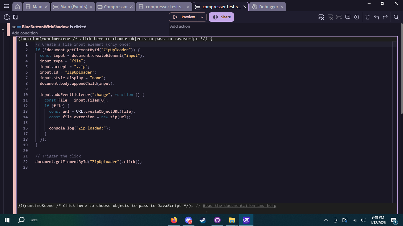 I want to import a zip containing a test image (.png), text file (.txt), and a music file (.mp3) into a running scene, but the farthest I’ve gotten is opening the zip, and I have no idea how to access the files or if it even loaded. I know I should use JSZip, and I have that downloaded when the scene loads, but that’s it. I really don’t want to use AI anymore than I have, so can someone please help ![]()