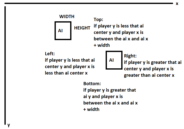 For checking the direction of the player: its simple x and y comparisions with width and height of the ai taken into account. (I recommend you just use CenterX and CenterY)