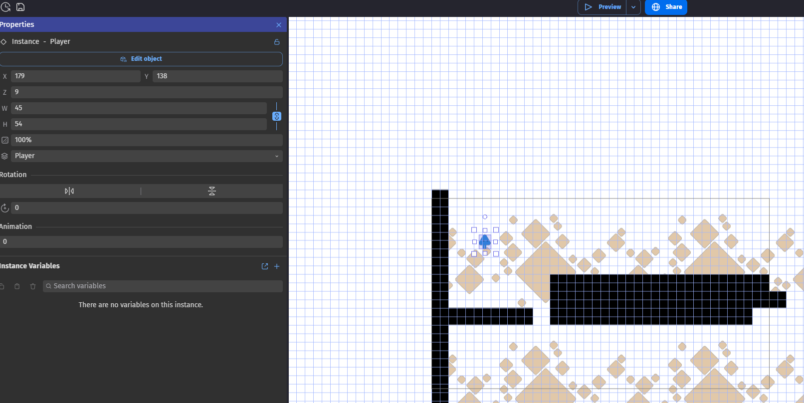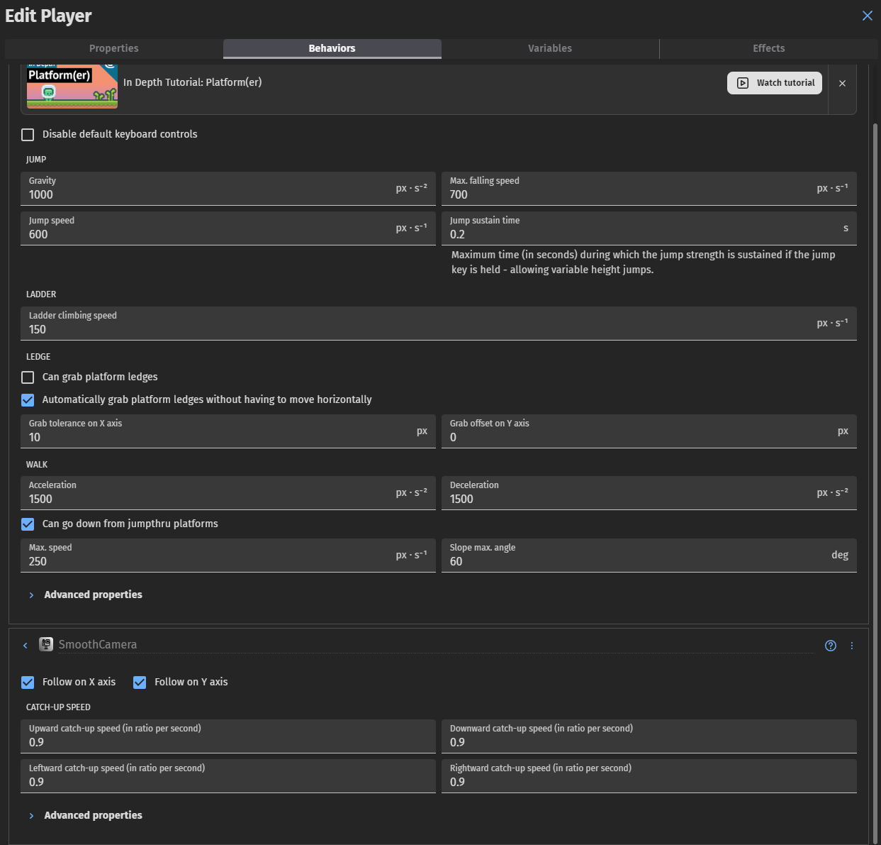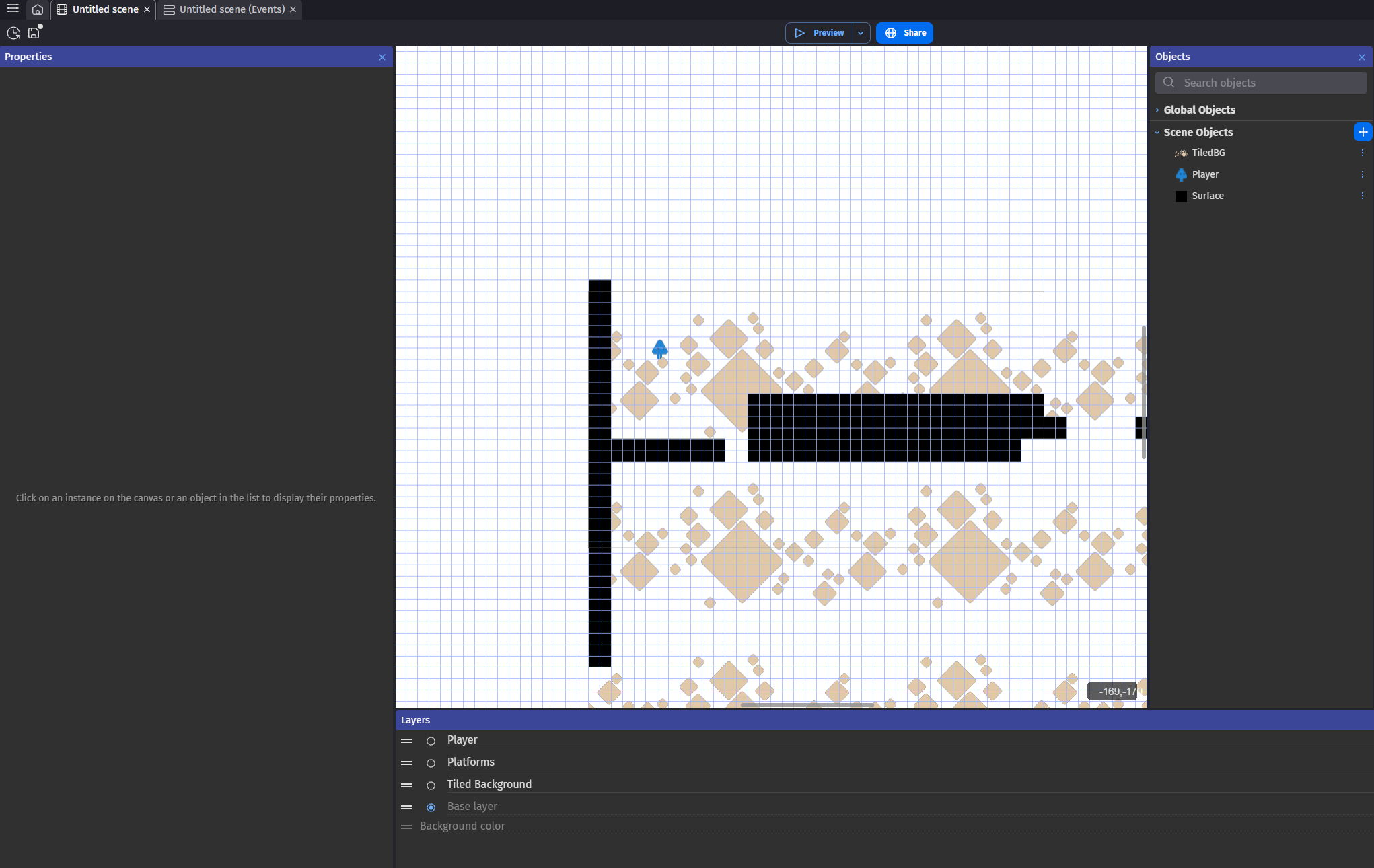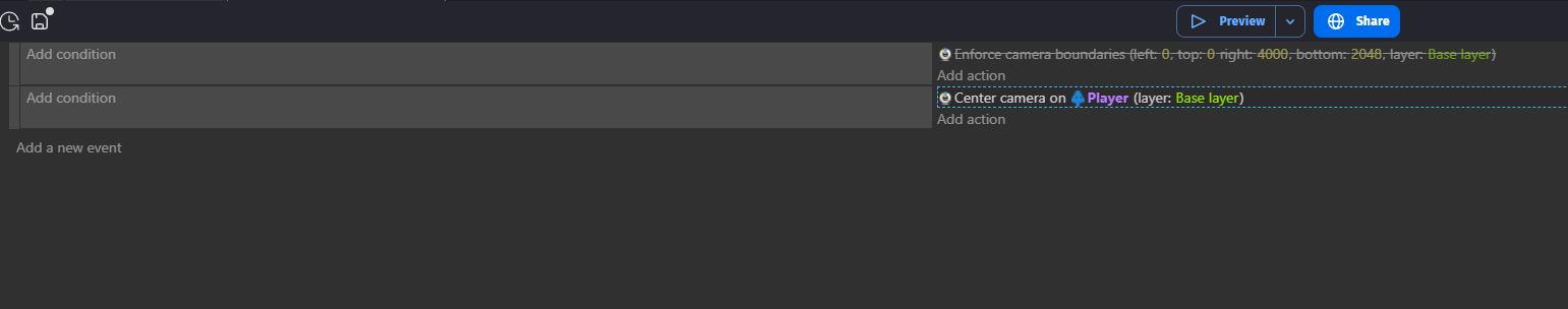 I wanted to make a simple test platformer. I gave the Player (blue triangle) a Platformer character behavior and added an event to center the camera on him. But when I previewed the game, he simply disappeared from existence. Additionally, giving him a Smooth Camera behavior causes him to glitch into surfaces.