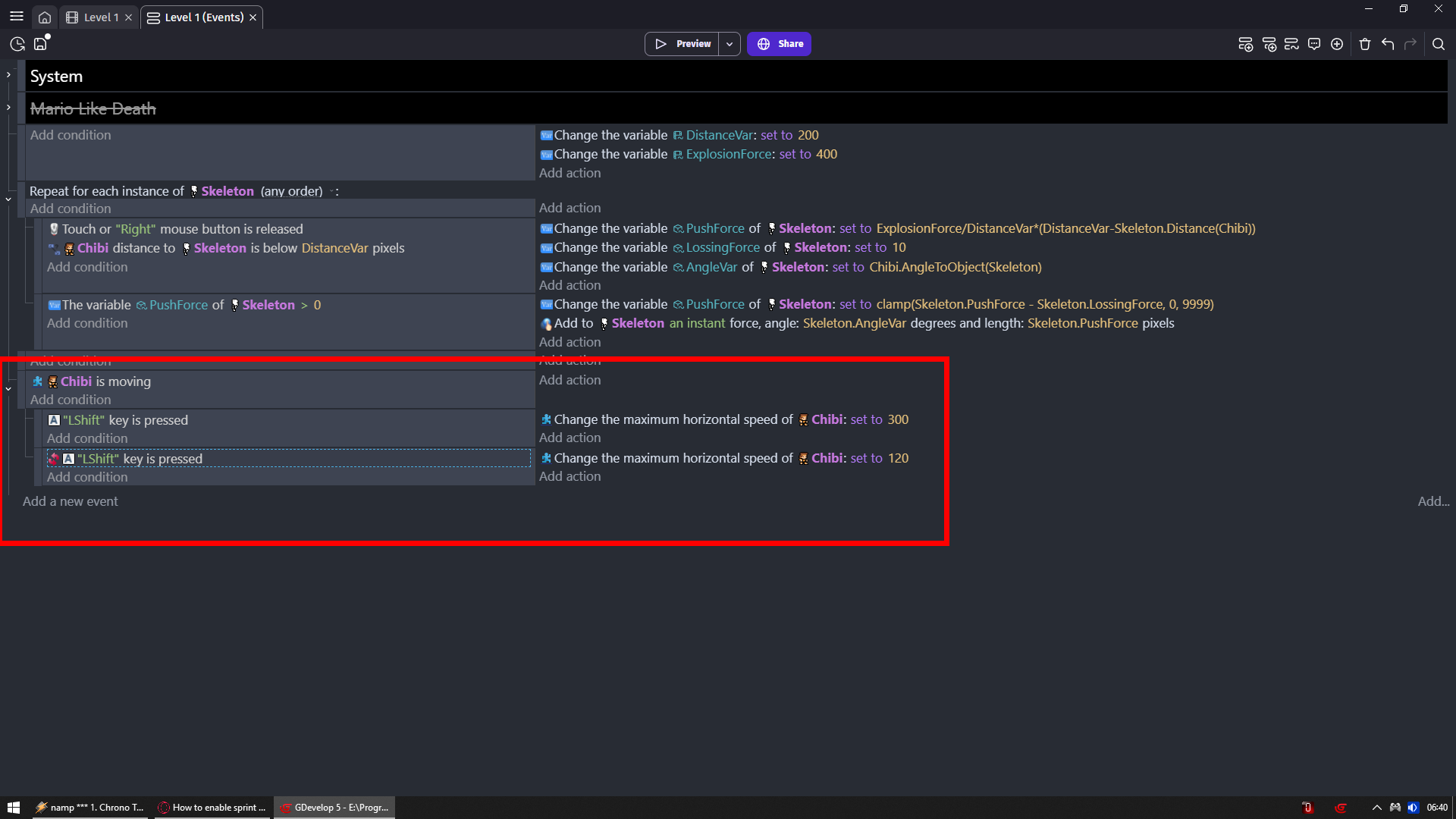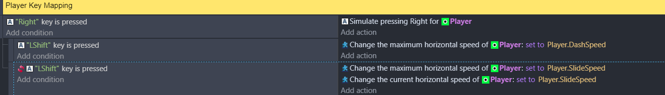 Hello everyone. I’m having trouble enabling sprint while holding down buttons. The expected behavior is to have the Player dash when the user holds arrow and Lshift but return to normal speed when Lshift is let go. Currently, the dash works but when I let go of Lshift, the dash speed remains.