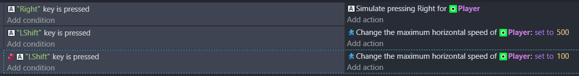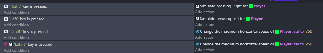 Hello thank you for providing screenshot but even after copying your logic, it still refuses to return to normal speed after letting go of Lshift. Do you think “simulate pressing right” is causing an issue?