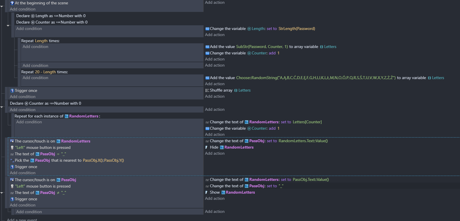 The game, after loading the window, randomizes for me using the extension “Choose::RandomString” random letters to 20 text boxes. See the screenshot, at the moment the player selects, for example, Letter1 and this one appears in the first field, the first letter of the password. But this is done wrong, because this way I have to describe each letter for each password field, and so on.