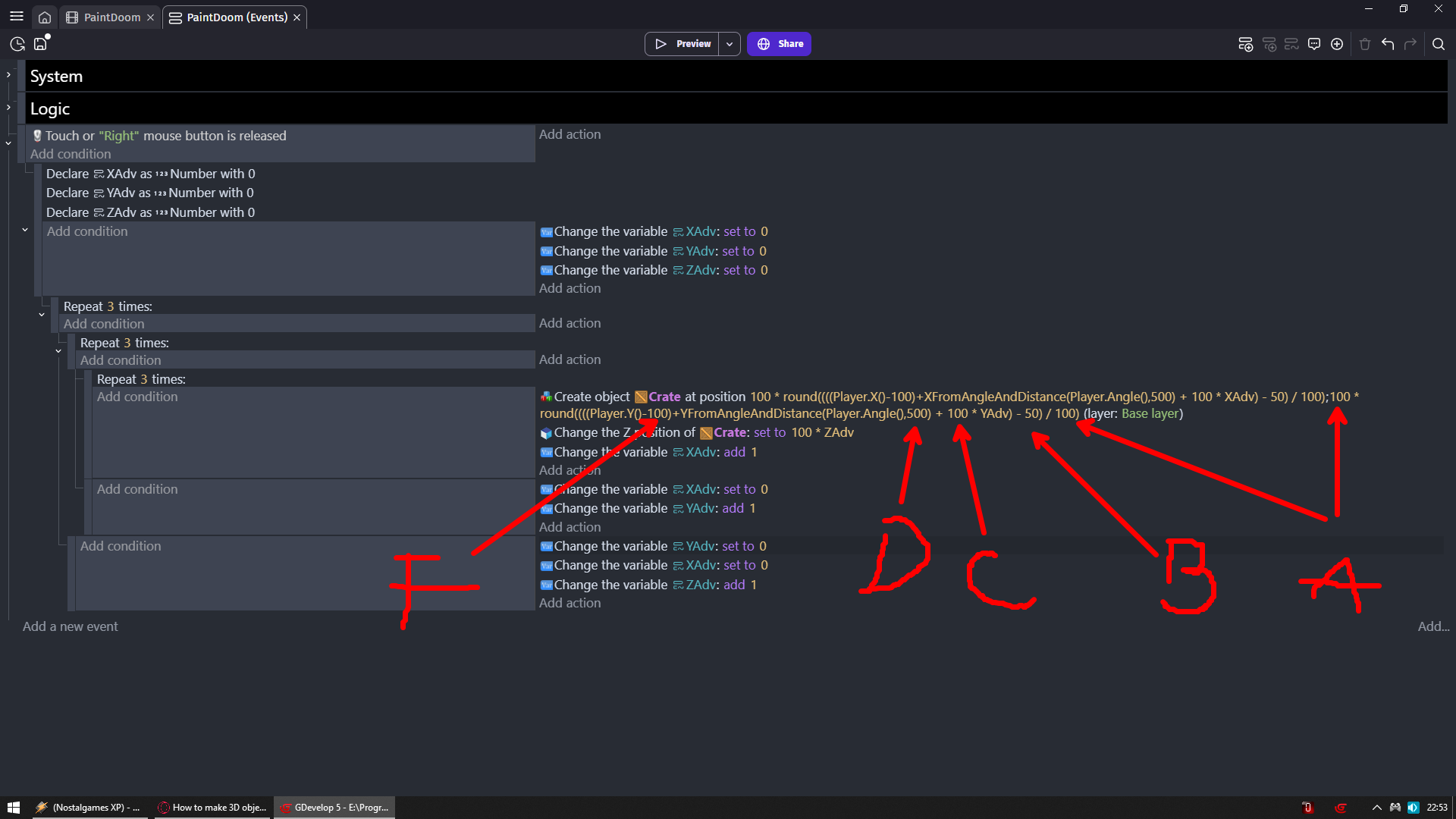 E - I forgot E but let’s say 2nd action that change elevation under create object action is E