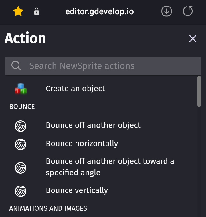 The bounce behavior is added to any object that might need to bounce off of something like a wall. You assign the behavior to the ball. Once assigned it adds the following actions.