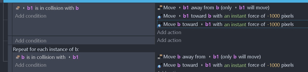 condition: b1 is in collision with b event separate b1 and b works but it’s not nice, they don’t bounce. So i want a force or impulse but they don’t work.