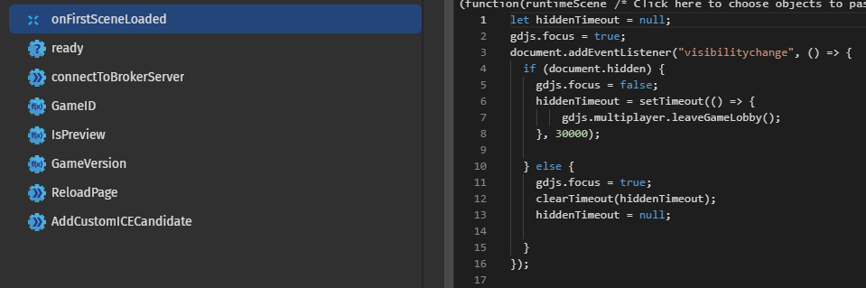 • Force disconnect players from multiplayer if they minimize the tab for more than 30 seconds, for example. Use the code in the screenshot. It should only be called once per game. This can be done using “on first scene loaded.”