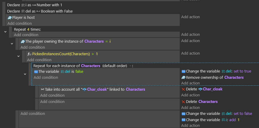 • On the host side, track the number of characters owned by players and remove any excess characters. In the event below, only the first character created will be removed, as that is the one causing the problem.