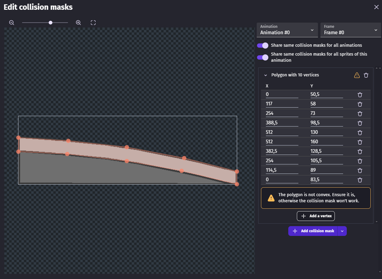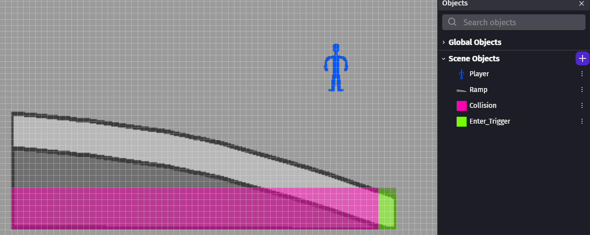 Thanks …hope that it works well. There’s two ramp objects and separate from refers to the one that has the base of the ramp as a collision. I’ll post shots of the collisions in a bit as what I did was have the player collision mask as a small box at his feet so that he can can behind and in front but not through objects. To detect collisions for the full body you’ll need to attach another object called say playercoll to it and hide it.