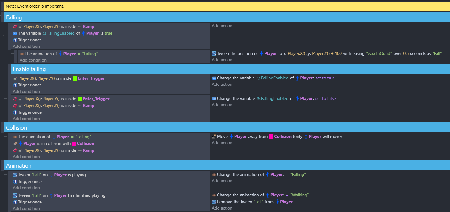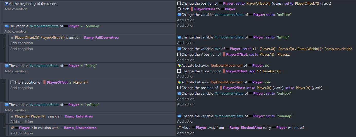 Added a screenshot for my approach. It works fine, but needs refinement. Just two things to note from my side: Falling distance needs to be tweaked to feel reasonable. Secondly, there is different ways of creating colliders here - I just duplicated my RampObject, put them on top of each other and edited their collision mask (out of lazyness - this is not the performance optimized approach)… Ah and thirdly the OriginPoints of the PlayerObjects are set to the bottom-center.