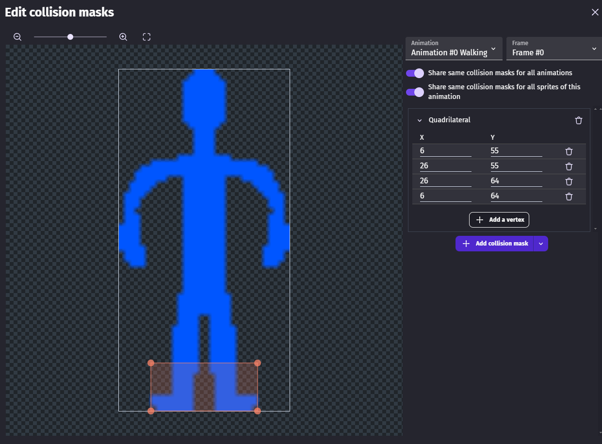 The collision mask is positioned at the bottom of the sprite to create a 3D effect, allowing the Player to walk in front and behind it. You can walk around the ramp, but not ‘‘up it’’.
