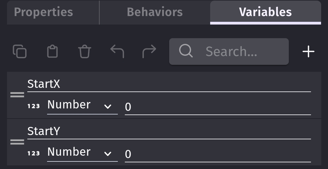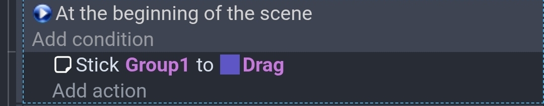 I created several objects and added them to a group named Group1. I added an object named drag and for testing I gave it the drag behavior. I gave all of the objects the object variables of StartX and StartY.