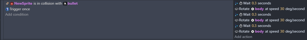 Hi - The Rotate actions needs to be used every frame and so what you’ve done there turns it a fraction of a degree every .3 seconds, three times. It would be better to start an object timer or change an object variable and then link the rotatation to that.