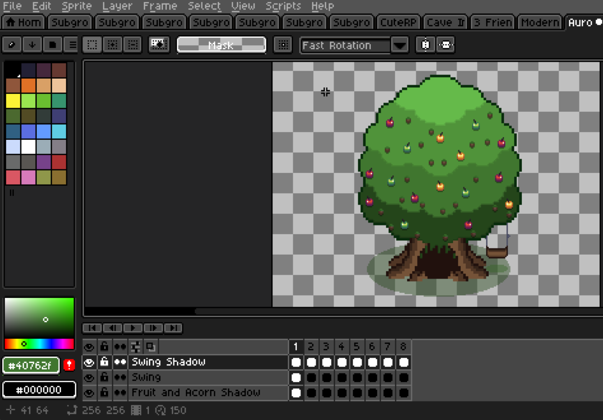 I’m trying to make the fruits and acorns actually look like they’re IN the tree, as opposed to looking like they’re ON it. To me, it looks like someone had a sticker set of pixel art fruits and what not and just slapped them on here. Technically, I kinda did that, but still. I want it to look a bit nicer than this.