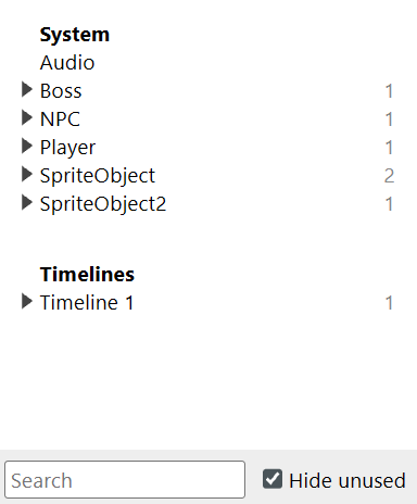 This is something that exists in most other engines including Construct3, I hope it would be possible to have something similar with Gdevelop. Below is an example in Construct3 that features a search bar and a toggle for unused objects.