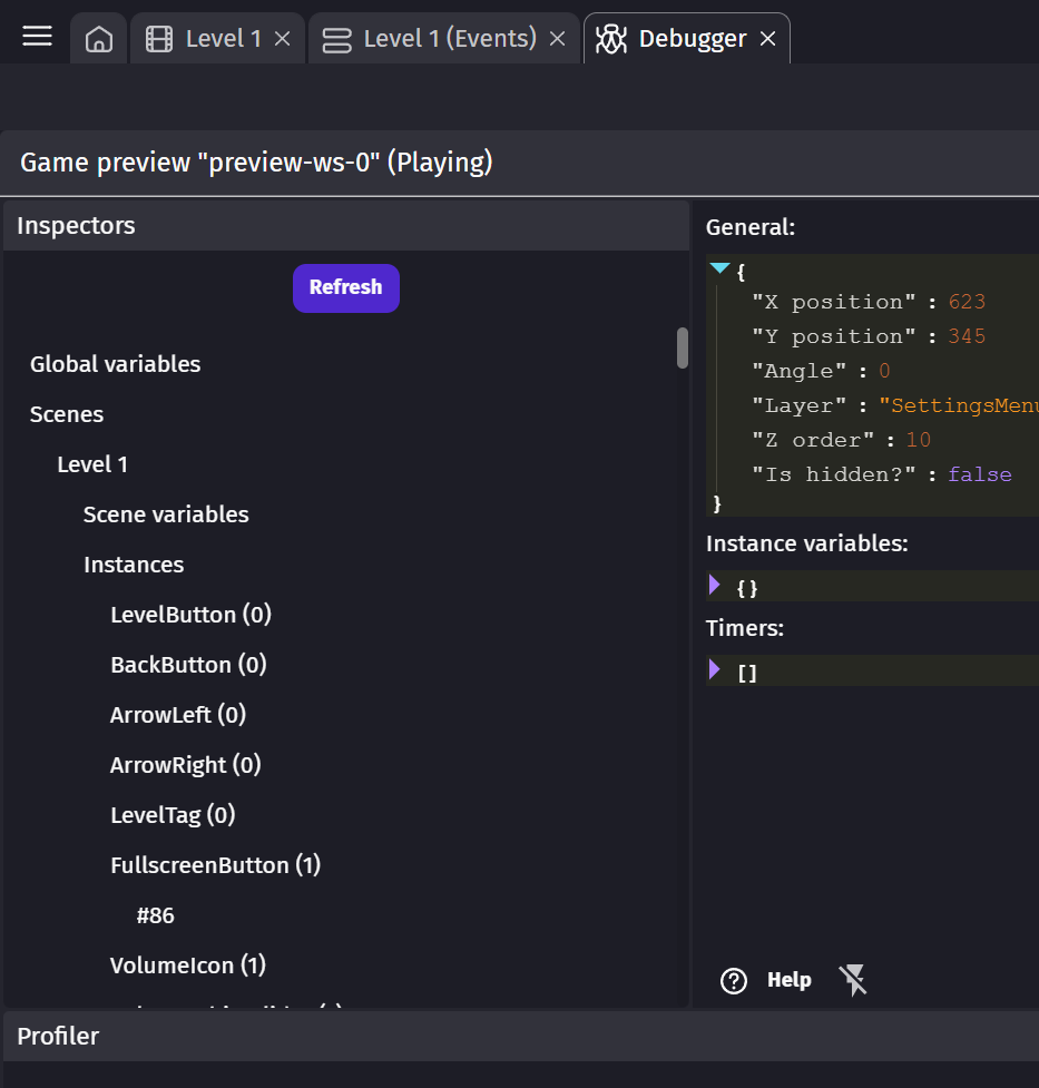 First problem : the debugger shows all objects of the scene and global objects, including those that don’t have a single instance… And there is no way to toggle it. That results in a very cluttered list that contains way more items than it should. For any medium project or anything that has dozens of objects, it becomes progressively unusable.