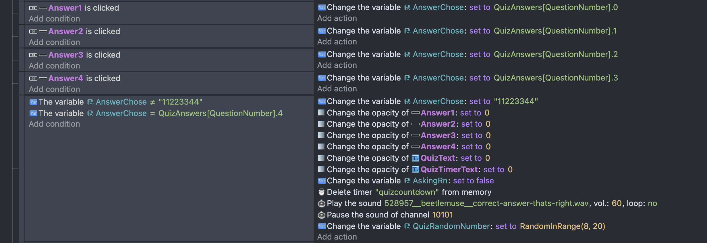 Hey! Not sure how much this helps, but for my game I made 2 arrays. One contained the questions, and one contained the answers. For the answers, I did 0-3 as the 4 possible answers, and 4 as the correct answer. So each was an array in an array. Example: Apple, Cookie Orange, Banana, Cookie (as which is not a fruit).