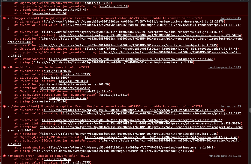 JavaScript errors should be displaying in the dev tools (or gdevelop debugger), looking like this:
