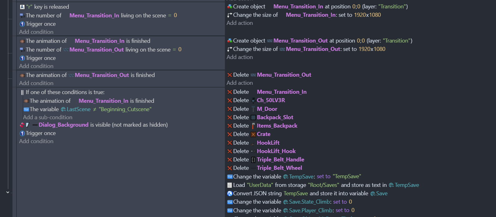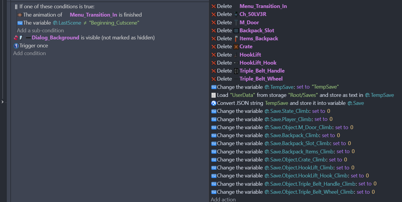Edit : To add a bit more the variable check on the first image (LastScene) might be faulty (could just constantly delete and load) but i haven’t tested that yet because there are no code on other scenes that changes that global variable and it’s defaulted as “Beginning_Cutscene”.