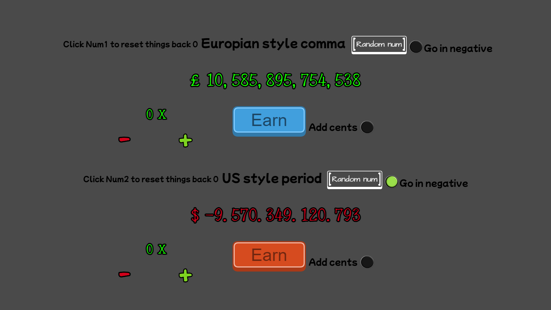 Pretty cool but, you have the styles mixed up. Euro style is to have periods and then use a comma for the decimal place. US is commas, with period for decimal place