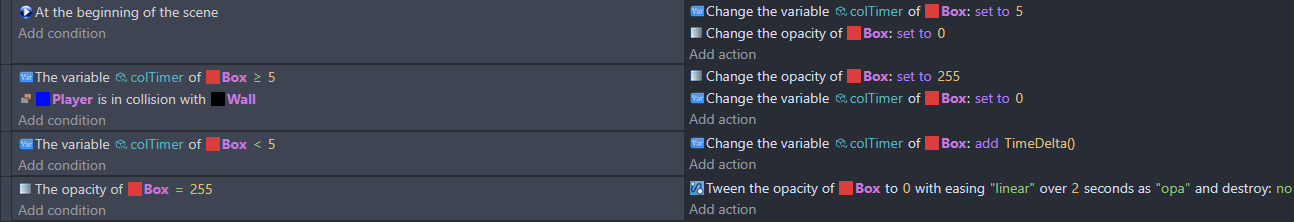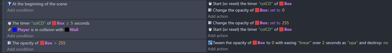 I don’t see an event where the opacity of the box is brought back to it’s original value. The tween MAY be running again, but as the opacity is already at 0, it will be tweening from 0 to 0