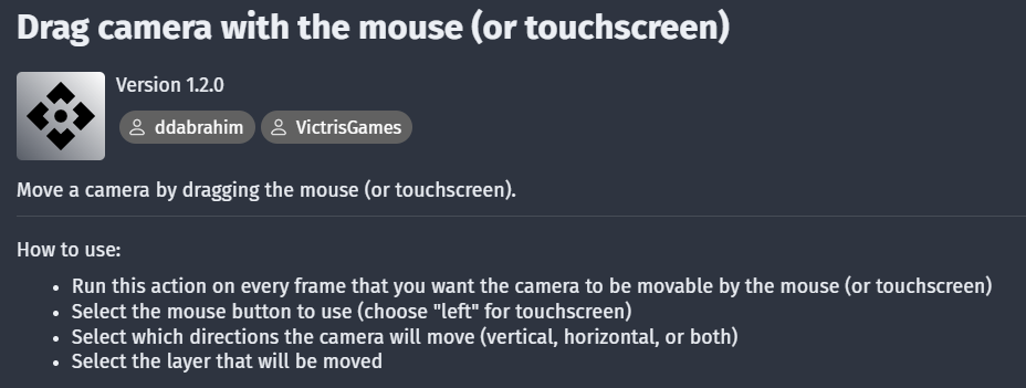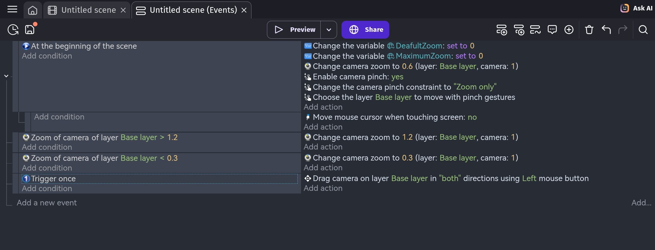 Hi! Its my first day on gdevelop, I’ve ran into just a few issues that took me very long time to figure out and so far I could only “successfully” achieve zoom in and out with touchscreen on my game, im lacking dragging and moving camera around, I’ve installed the extension but I have no clue why it won’t work, I’ve made sure everything’s on same layer, could you please look into my events and suggest a solution:pray: