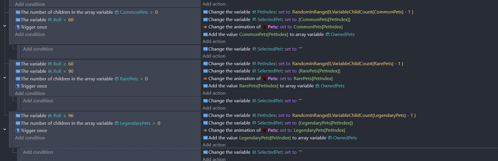 The gacha is already working through animation, i just need it so the player will be able to select or see the pets they owned. I already created the same object with same animations, yes the name of the animations is the same. I just need to know how would it able to change through animations that the player owned