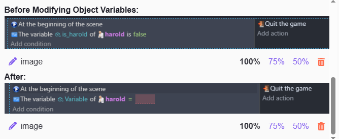 (Deleting an object, changing boolean value, etc) - Now ALL conditions and actions that refer to variables of that object is wrong.