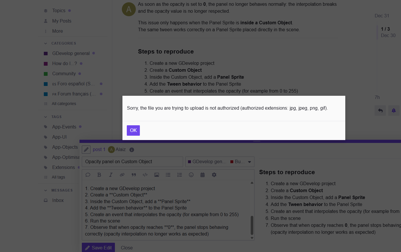 When using a Panel Sprite inside a Custom Object, applying the Tween behavior to interpolate its opacity does not work correctly.