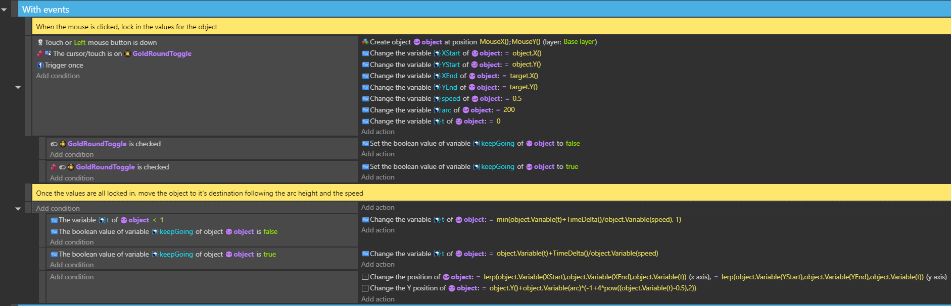 Once I click, both objects snap right back to the spots I originally put them in and function seemingly normally. However, if I click again either when they stop or mid-flight, they snap back to their starting positions. My hope is to make it dynamic so that they take their CURRENT position and jump from THAT spot instead of snapping back to where they started.
